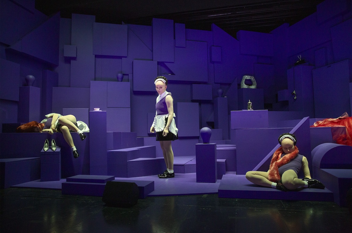 Die klaustrophobische Bühne, die Mirjam Stängl ebenfalls in horrortaugliches Lila gefasst hat, schränkt ihre Bewegungsfreiheit ein durch wild aus dem Boden und den Wänden wuchernde Auswüchse. Wie in einem skulpturalen Flagshipstore liegen darauf für die Rollenwechsel außer Dienstmädchenschürze und -häubchen barocke Kostümversatzstücke und eine Perücke parat, fürs Auftauchen und Verschwindenlassen gibt es knarzende Adventskalendertürchen und einen Abgrund, aus dem eine Kloake gluckst.