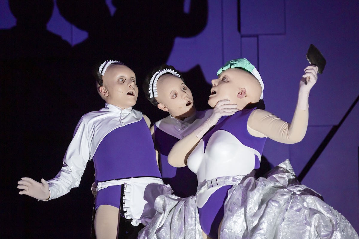 Vielmehr treibt sie die Uneindeutigkeit noch weiter: während sich bei Genet das Schwesternpaar Claire und Solange in Abwesenheit der Herrin spielerisch aufspaltet in Zofe und Herrin, um bei deren Rückkehr in die Dienstbotenrolle zurückzufallen, tauschen in Frankfurt ständig alle drei – Aleksandra Ćorović, Katharina Linder und Nina Wolf – die Rollen. Ihre Grundausstattung macht sie komplett verwechselbar: glatzköpfige Latex-Vollmasken, lilafarbene Strampler, fleischfarbene Ganzkörperbodies, flache Lackschuhe (Kostüme: Sabrina Bosshard). So wirken sie wie babypuppenhafte, nicht ganz zuende geborene Zombies.