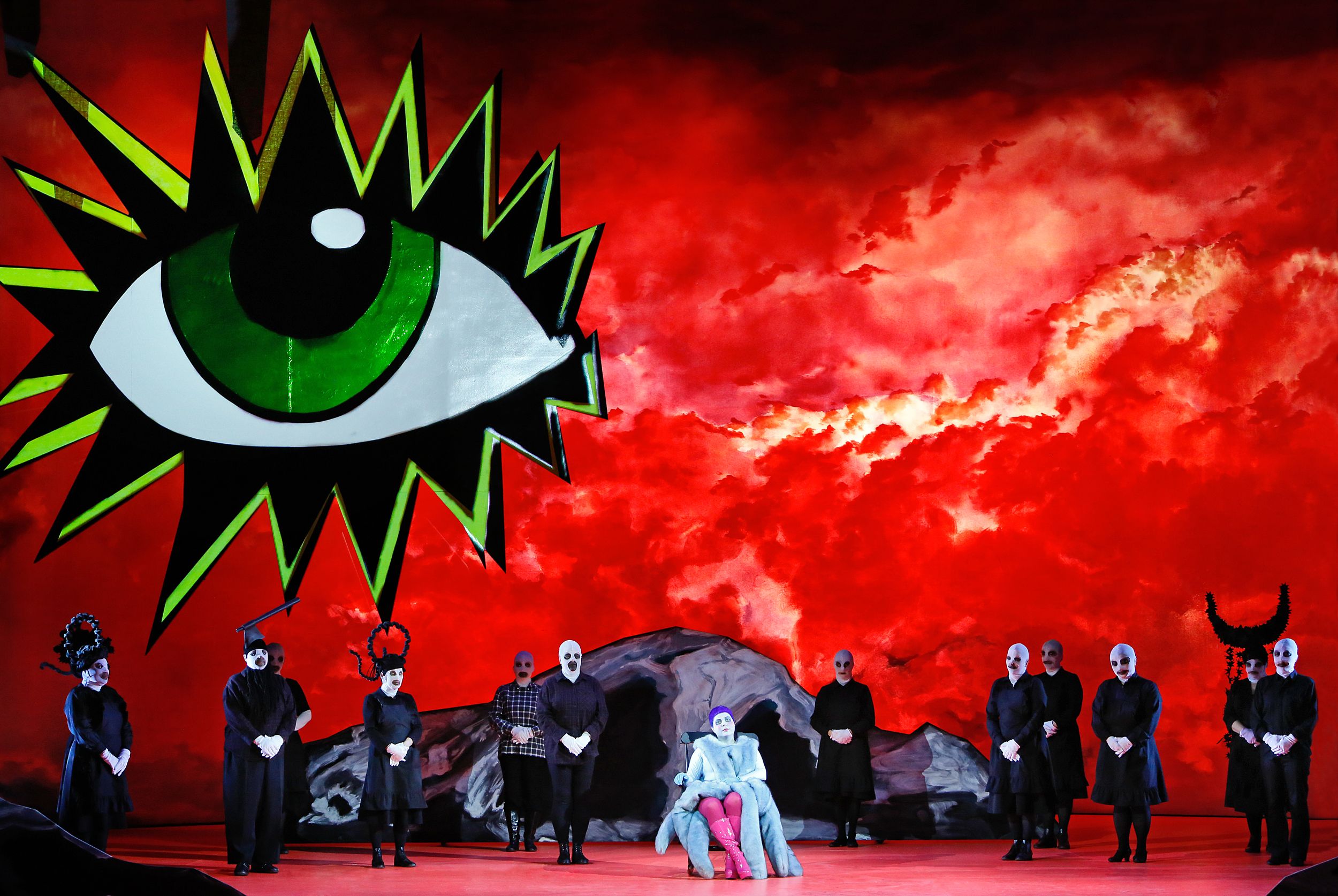 Oder es wird gewitzelt. In Kaspars Trinklied singt er nicht "Ohne dies Trifolium gibt es kein Gaudium, sondern "ohne Laudanum" (die Droge). Wenn Agathe (Margarethe Fredheim) zuversichtlich singt "Das Auge ewig rein und klar, nimmt aller Wesen liebend wahr", glüht hinter ihr ein brennend roter Wolkenhimmel ohne Sonne und ein riesiges Auge sinkt herab. Annchen (Emma McNairy) singt von "verschämter Mädchen Art" und schlägt dabei drei lustvoll stöhnende Männer mit der Domina-Peitsche.