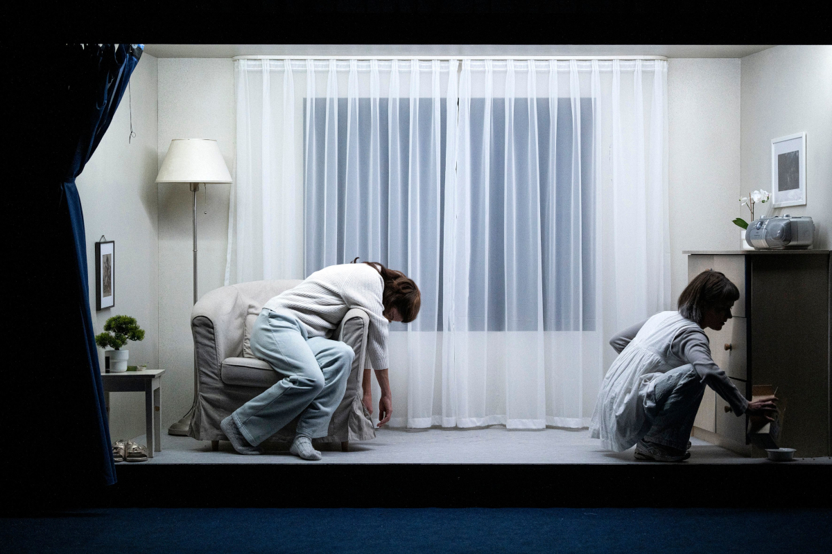 29. November 2025. Licht fällt auf der dunklen Bühne aus einem großen, hellen Kasten. Hinter einem dünnen Vorhang windet sich eine Person wie unter Schmerzen – oder als hätte sie einen schlechten Traum. Der Kasten entpuppt sich als die Wohnung von Vera und ihrer Mutter, ein kleinbürgerlicher Albtraum in Weiß und Beige, gelegen über einer 24-Stunden-Kneipe und an einem Fluss, der den Abfall der Stadt mit sich trägt. Die Mutter ist gelähmt von schrecklichen Erfahrungen, die nicht die ihrigen sind, Vera hingegen versucht, einen Ausweg aus dem Stillstand zu finden.