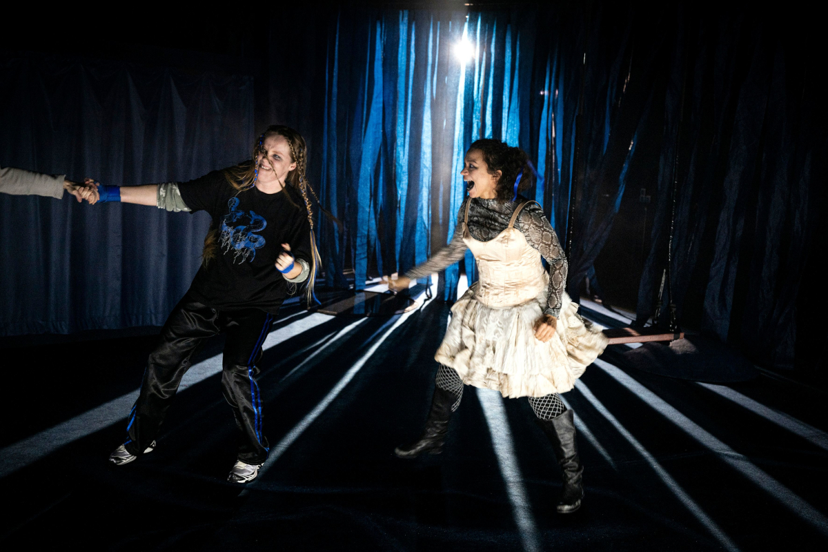In Sina Ahlers' "Schamparadies", 2020 beim pandemiebedingt abgesagten Heidelberger Stückemarkt mit einem Autor:innenpreis bedacht und jetzt erst uraufgeführt, überquert Vera den Fluss und begegnet den Furien Tine und Mascha (herrlich gespielt zwischen Überdrehtheit und Körperbetontheit von Katharina Brehl und Emma Bahlmann). Die Furien bringen Vera eine neue Sprache bei und lehren sie, ihren eigenen Körper zu entdecken. Brehl und Bahlmann treten mit verzierten Sturmhauben auf und rufen damit Erinnerungen an Pussy Riot wach, die mit ganz ähnlicher Kopfbedeckung gegen die russische Regierung demonstrierten.