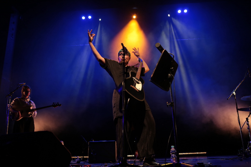 Doch zum Glück gibt es ja Künstler:innen wie River L. Ramirez, New Yorker Comedian, Musiker:in und Schriftsteller:in, mit grünem Haar, E-Gitarre und irisierender Stimme, und mit der Show "GhostFolk", in der River irgendwo zwischen Konzert und Comedy mit süffisanter Ironie Songs über gebrochene Herzen singt und anarchische Konzepte in den Raum stellt wie das einer Baby-Ökonomie. Dabei tänzelt River stets auf der Metaebene, persifliert Zuschreibungen, auf dass diese unwirksam werden, inszeniert und stilisiert die eigene "Marginalisierung" und reißt Witze darüber, nicht witzig zu sein. So richtig mag der Funke dennoch nicht überspringen.
