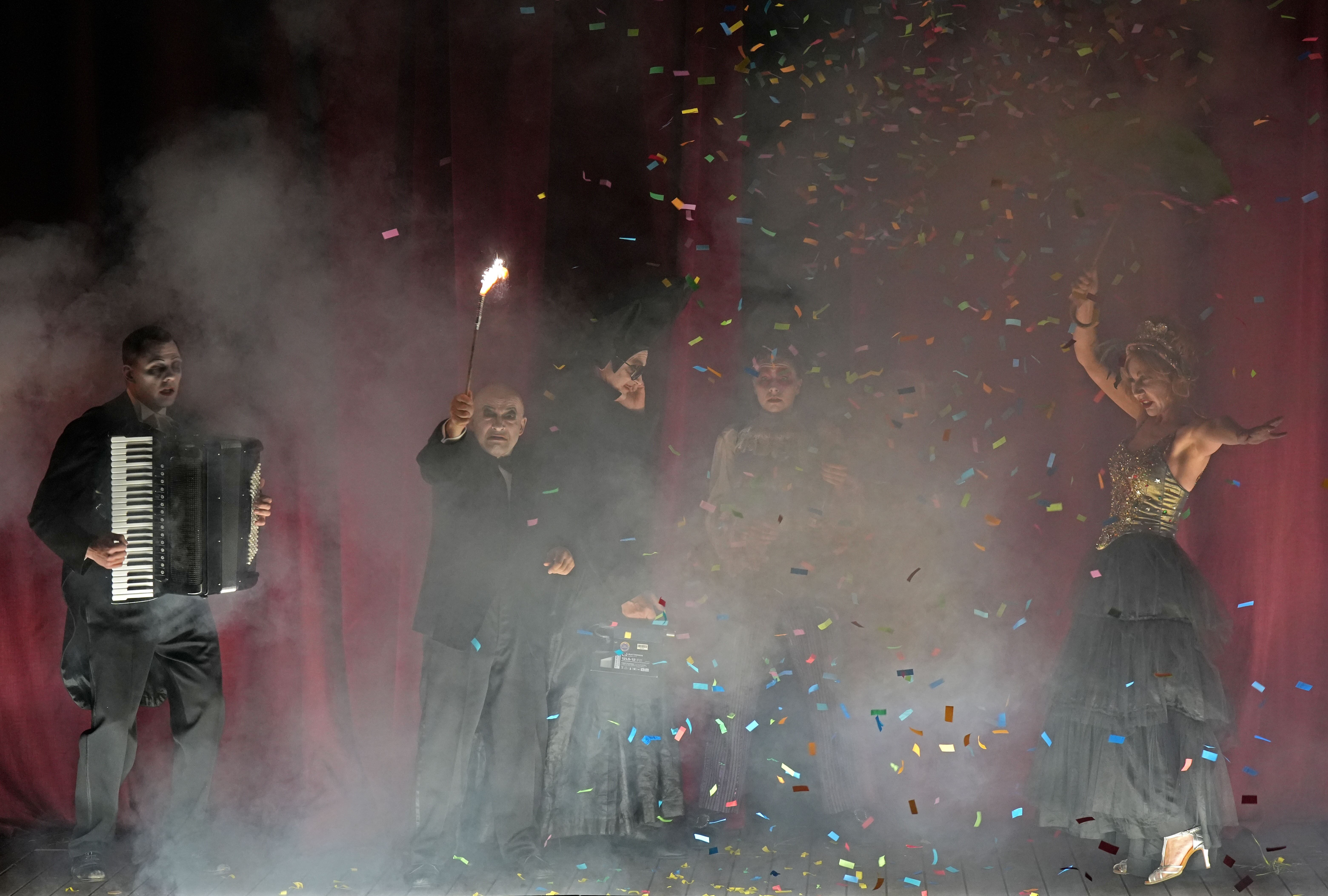 Das Theater selbst spielt mit auf der zeichenreichen Bühne von Hana Ramujkic; während Britta Leonhardts Kostüme von Beginn an grandios und markant sind. Schließlich platzen immer wieder Luftballons mit ziemlich viel rieselndem Flitter und Glitter drin, auch im Detail wird mit kleinen und größeren Tricks gezaubert.