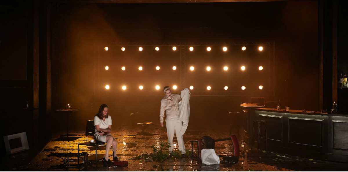 Komplex ist das nicht. Es dient als Rahmen für Streitgespräche und Tiraden, das Wälzen von Argumenten und das Hinstellen von Wahrheiten. Paradoxerweise erscheint das Stück dadurch im deutschsprachigen Bühnengeschehen umso unkonventioneller, auch weil Lepper und sein Team sehr wohl etwas machen: Dem geforderten Antirealismus tragen sie Rechnung, indem sie den gesamten Abend in der Bar des ersten Teils ansiedeln. Bloß hat es darin geregnet, der Boden ist ganz nass – simpel, aber unbehaglich.