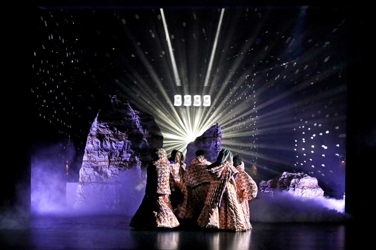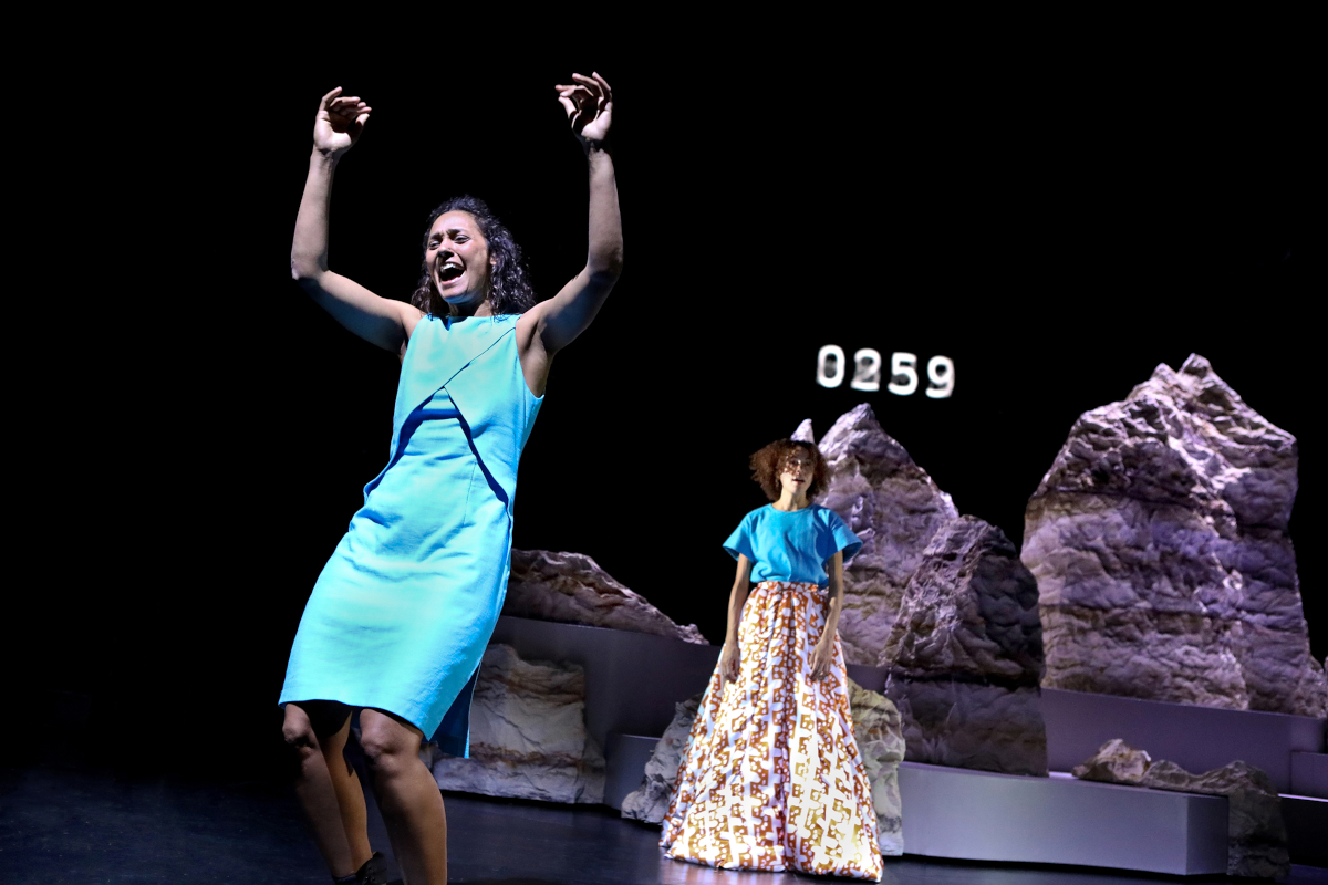 Das Zusammenspiel von Bühne (Nicole Marianna Wytyczak, die auch schon in Hannover mit Ibrahim gearbeitet hat), Licht (großartig von Markus Fuchs) und Ton (Gertfried Lammersdorf) ist hervorragend. Die begehbare Felsenlandschaft harmoniert farblich mit den hellen Erdtönen der Kostüme und erhält durch die aufregende Beleuchtung, die jedes Thema anders gestaltet, fast schon ein Eigenleben. Den Rahmen bildet das auf den Bühnenvorhang projizierte Meer, das Fruchtbarkeit und Unendlichkeit verströmt.