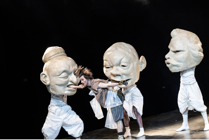So ist das Ende, das wie bei Brecht offen bleibt, aber auf den Hilfe-Schrei Shen Tes keinen Epilog mehr folgen lässt, auch eine Erlösung aus dem zunehmend lärmenden Stückgeschehen. Die Götter, die hier von einem diversen Ensemble-Trio mit riesigen Masken-Köpfen gegeben werden, schleichen sich aus der Affäre. Sie haben auch hundert Jahren später keine Idee, was sie einem Menschen raten sollen, der gut sein will, aber nicht kann.