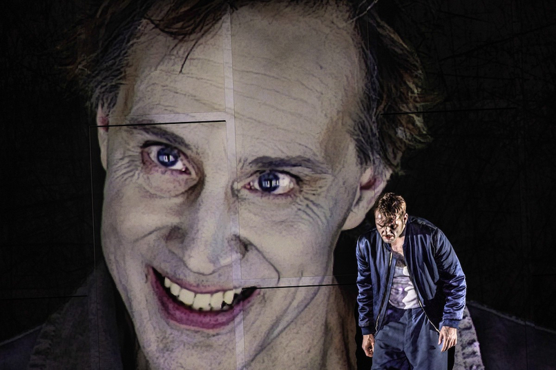 Dank der Hubsysteme des Düsseldorfer Schauspielhauses hat diese Bühne aber auch eine entschieden vertikale Dimension. Ein leerer Unterbau hebt den Kubus in die Höhe und erlaubt Raumspannungen von grandioser Wirkung. Live-Szenen und Filmeinblendungen finden parallel statt. Beispielsweise sieht man den von Sebastian Tessenow gespielten Woyzeck, wie er seinen Hauptmann (Thiemo Schwarz) rasiert, und in einer filmischen Weiterführung, wie er ihm die Kehle durchschneidet.