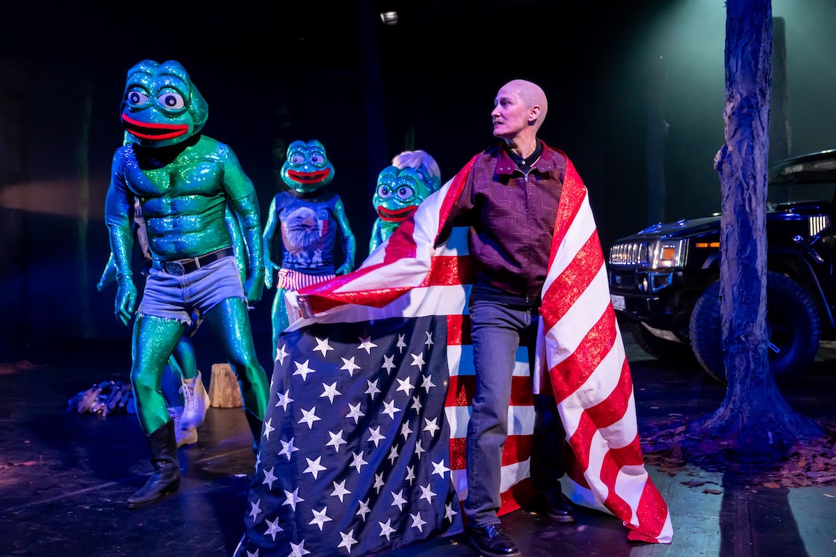 Auf der Videoprojektionsfläche sieht man die Männergruppe bei Kampfsportübungen im Wald. Auch auf der Bühne ragen Bäume wie Männer in die Höhe (Bühne: Eva-Maria Bauer). Optischer Höhepunkt ist eine zehn Meter lange Stretchlimousine, die durch das Rolltor der Spielstätte "Depot 2" auf die Bühne fährt. Heraus purzeln dann sechs knallgrüne Pepe-Frösche. Und Juri Englert als Oberfrosch erklärt uns, wie die harmlose Comicfigur über Memes zur Symbolfigur der neuen Rechten wurde. Eine Plastik des Nazi-Bildhauers Arno Breker, der Mann mit dem Vogelkopf, wird zum Dialogpartner für Yvon Jansens Autorenfigur. Immer findet die Inszenierung ein Bild, das die dargestellte Szene nicht illustriert, sondern leicht schräg verfremdet. Die Bilder verspotten die markigen Sätze.