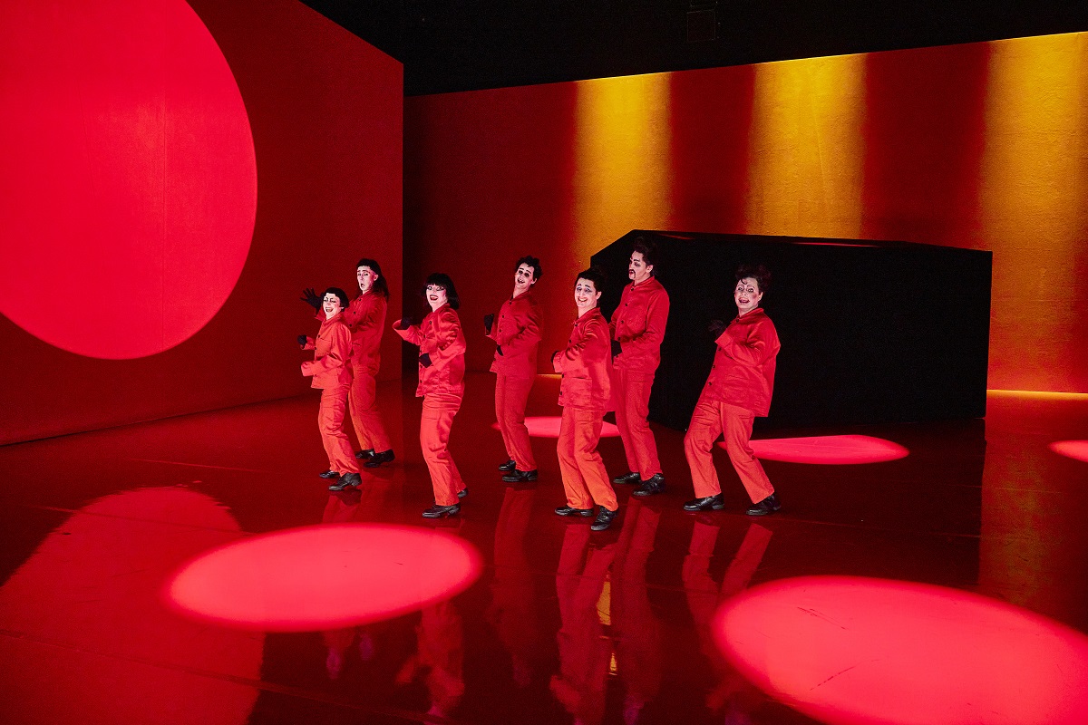 In den ersten Minuten dürfen Requisiten und Technik einmal ganz zu sich selbst kommen. Ein schwarzer Kubus, oder vielleicht ist es auch ein Zelt, bewegt sich über die Bühne. Dazu gesellt sich ein Scheinwerfer auf einem fahrenden Podest. Er kann sich scheinbar frei bewegen, mit seinem Lichtpunkt wie mit durchdringenden Blicken die Gegend absuchen, den Blick heben und senken, in Kontakt treten. Der schwarze Kubus lässt an die Kaaba in Mekka denken, an die rätselhaften Stelen, die in Kubricks "2001: Odyssee im Weltraum" auf allen Zeitebenen auftauchen. Oder ist es eine stilisierte Jurte eines nomadischen Volks? Das schwarze Ding auf der roten Bühne (alles ist hier entweder schwarz oder rot, nur Schminke weiß) jedenfalls gebiert sieben Figuren mit weiß geschminkten Gesichtern nach Art der Pantomimen oder Clowns. Es kann die Sieben auch wieder aufnehmen oder einfangen.