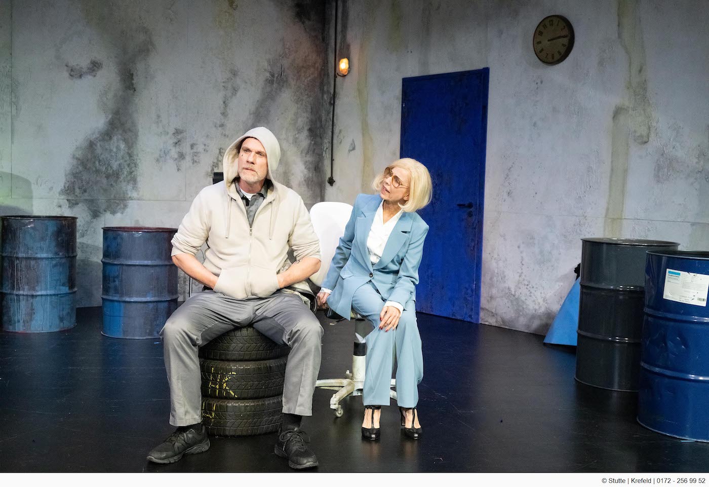 Auf der Bühne im Studio des Theaters Mönchengladbach wurde von Bühnenbildnerin Vesna Hiltmann eine sehr hübsche Werkshalle gebaut: drei schmutzige Wände in weiß, rot und blau, ein pittoreskes Sprossenfenster, Öltonnen, Reifenstapel, Computer. Nur: keine Autos. Denn dem Konzern geht es seit einigen Jahren so schlecht, dass er offen dafür ist, in die Rüstungsindustrie einzusteigen – und damit eine finstere Parallele zu den 1940er Jahren eröffnet, als VW auf einmal statt Autos Kriegsgeräte lieferte: Bomben, Panzerfäuste, militärische Fahrzeuge. Das Wort "PANZER" steht auch auf dem Banner, das auf der Bühne bis zum Boden hängt.
