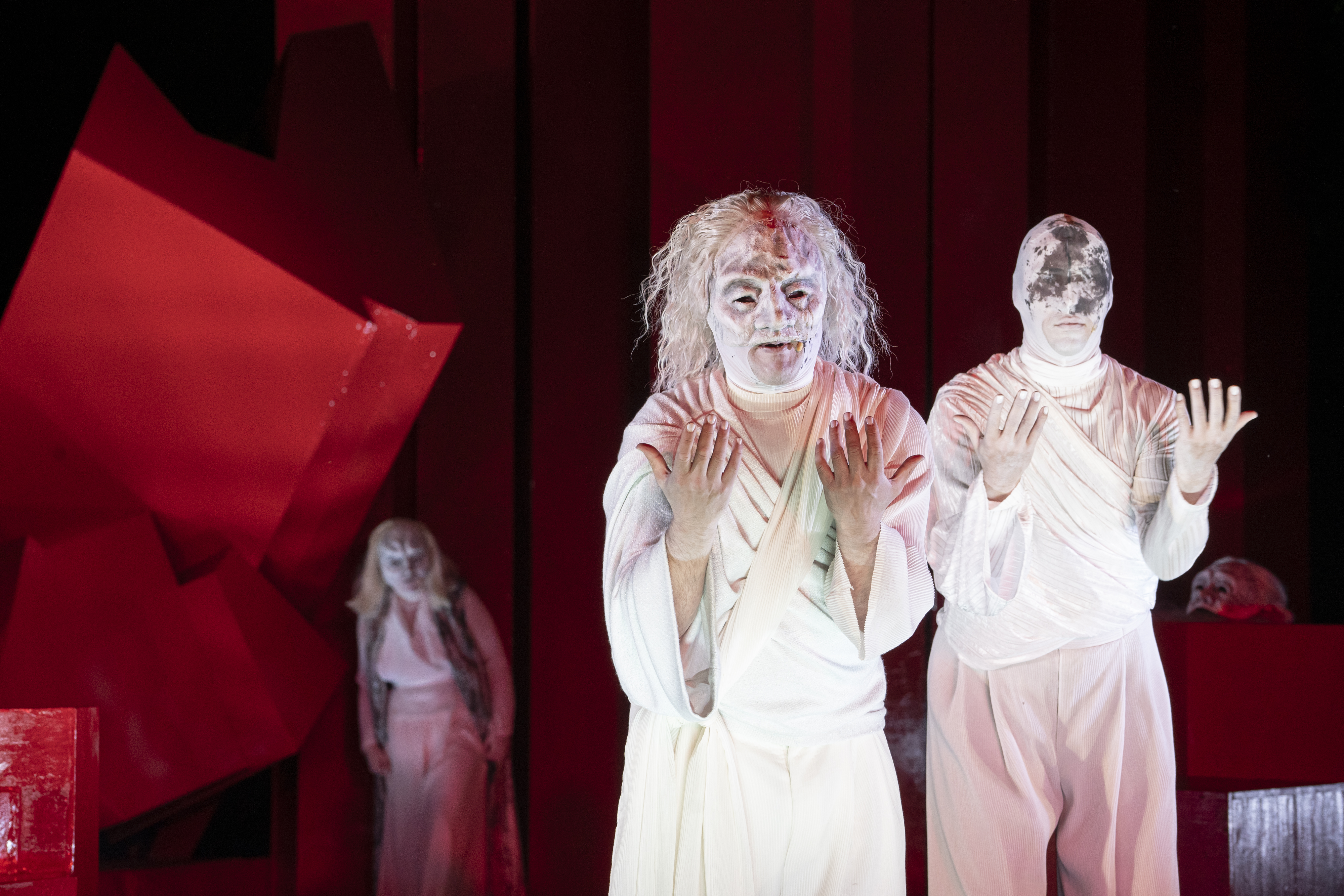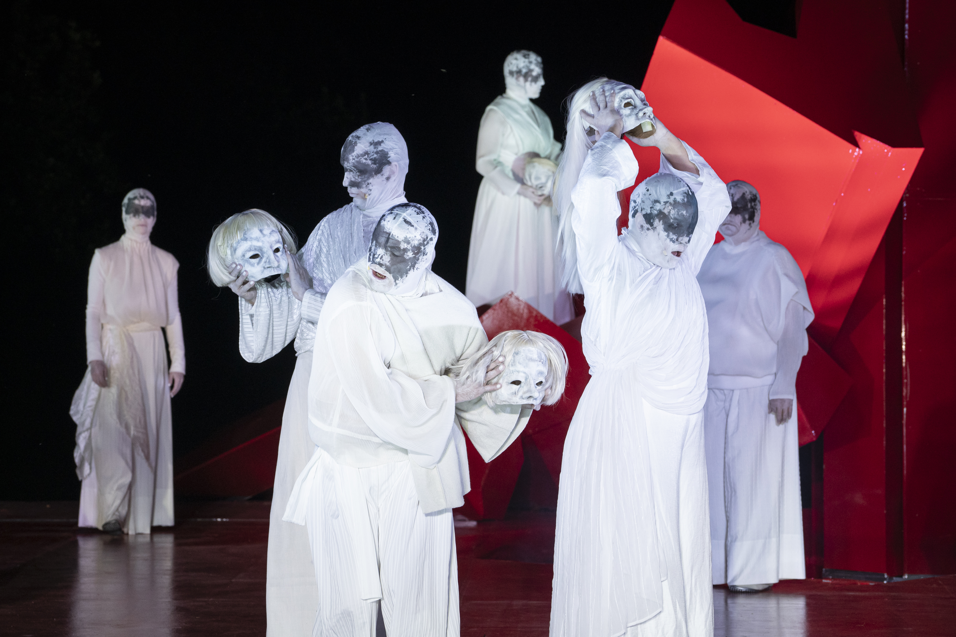 Gespielt wird auch wieder draußen, im Raffelbergpark. Sophokles unterm Abendhimmel wie im alten Griechenland. Nur dass sich bei dieser "Ödipus"-Version der jungen Regisseure Alexander Klessinger und Mats Süthoff eben erst mal Aliens durch den Park zur knallroten Bühne bewegen – gesichtslose Wesen aus einer fernen Zukunft in weißen Kleidern (Kostüme: Sophie Leypold), trippelnde Schritte, gerader Oberkörper, starre Bewegungen. Dazu hören wir nachrichtliche Ankündigungen der Voyager-Sonde, die 1977 ins All startete, mitsamt der Goldenen Schallplatte, die Musik, Grußbotschaften, Sounds und Grafiken enthält, die Außerirdische über das Leben auf der Erde informieren sollen. Die Mülheimer Aliens allerdings finden Masken – auch ganz nah dran am Theater der griechischen Antike – und darunter die verhängnisvolle Geschichte des Ödipus, diese Tragödie um Vatermord und Mutter-Sohn-Inzest.