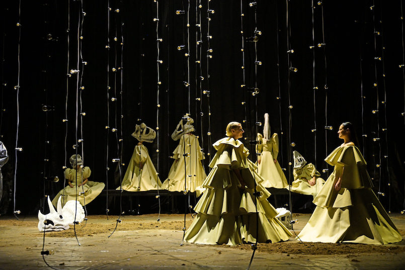 14. Oktober 2023. Gerade erst hat Bühnen- und Kostümbildnerin Franziska Isensee den Oberhausener Theaterpreis für ihre oft überzeugende Ausstattungsarbeit erhalten. Jetzt legt sie nach: Im schwarzen Bühnenraum bilden die großen, von der Decke hängenden Lichterketten ein nächtliches Sternenzelt, durch das acht eigenartige Figuren in überdimensionierten Reifrock-Gewändern und mit riesigen Tierschädeln umherwandeln. Dazu singt Sopranistin Ekaterina Isachenko im schwarzen Overall "In der Fremde" aus Robert Schumanns "Liederkreis": "Aus der Heimat hinter den Blitzen rot / da kommen die Wolken her, / aber Vater und Mutter sind lange tot, / es kennt mich dort keiner mehr." Damit wird der Ton für die folgenden gut drei Stunden gesetzt, in der sich die acht Personen jeweils ihres Totenschädels entledigen, aus dem Bühnenhintergrund nach vorne treten und ihre Perspektive auf das große Menschheitsthema vom Alleinsein, Verlassenwerden, von der Sehnsucht nach Geborgenheit und Gemeinschaft darlegen.
