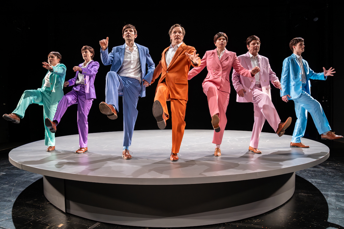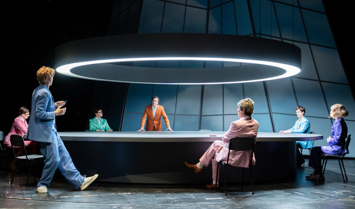 Genial die Kostümierung der sieben Schauspieler*innen in einförmige, knallbunte Anzüge, deren Farben von Lila über Blau bis ins Grüne reichen. Holtrop leuchtet in energischem Orange aus diesem Konzept heraus. Der Einheitslook wird durch hässliche Perücken verstärkt (Alexander Wilß als der geschasster Thewe erinnert dadurch ein bisschen an Horst Schlämmer). Ansonsten herrscht Understatement: Einfache Stühle statt Chefsessel, Anzüge von der Stange, kein Blingbling, nur Kristen Potthoff darf als Gabriele Heinzen mal in rote Lackstiefel und Satinbluse schlüpfen. Das monochromatische Konzept wird bis in die sparsamen Requisiten (Annette Seidel-Rohlf und Sona Ahmadnia) durchgehalten, eine großartige Optik.