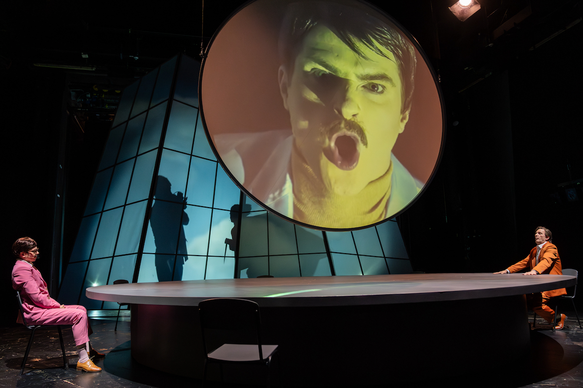 Bühne und Kostüme der Paderborner Inszenierung sind so einfach wie überzeugend. Hier hat Luisa Wandschneider einen großen Wurf gelandet: Vor einer an Hochhausfassaden erinnernden Fensterwand steht ein riesiger, gut vier Meter durchmessender, runder Konferenztisch mit sieben simplen Stühlen drumherum und bildet die Bühne dieser Machiavelli-Welt. An ihm sitzen, um ihn herum pesen oder auf ihm tanzen die Schauspieler*innen, und wenn sich das Ganze auf der Drehbühne dreht und einer nach dem anderen New Economy Sprech brabbelnd an uns vorbeizieht, ist das Karussell der Karrieristen gruselig anzuschauen.