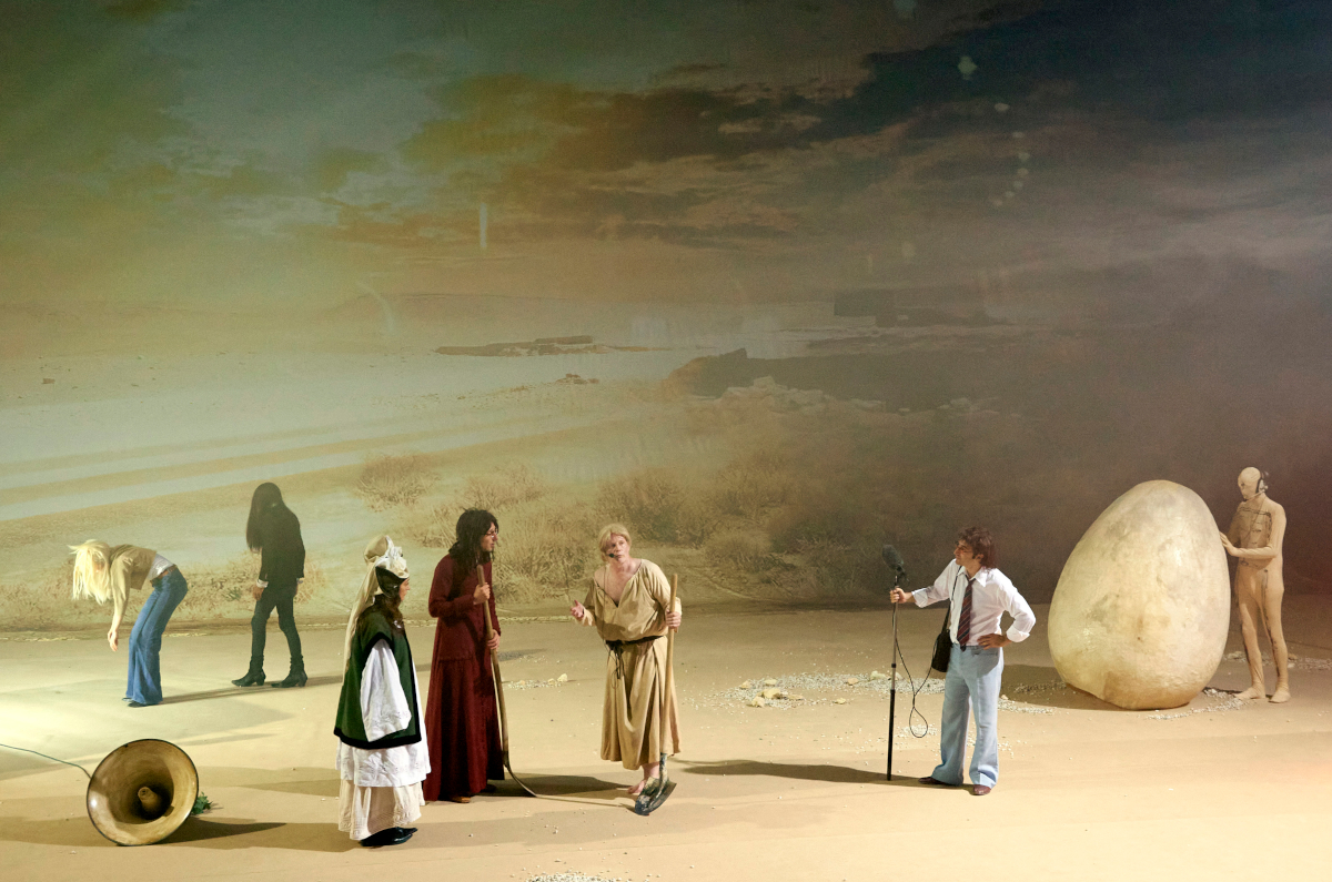 Und folglich ist die Menschheit erlösungsbedürftig. Das Ei wird gekippt, alle sehen in die Höhlung hinein, genau wie eine kleine Menschengruppe auf Hieronymus Boschs Bild. Ein Wummern und Dröhnen hebt an, am Himmel des Prospekts erscheint ein Dreieck, wird immer größer, füllt die ganze Fläche. Alle starren es begeistert an, als wäre es die göttliche Trinität – und es verschwindet. Ob das Erlösung war oder Untergang? Quesne erreicht eine emotionale Öffnung. Man wird nicht fokussiert, sondern durchlässig für Stimmungen. Die Gelassenheit und Sorgfalt so verschiedener Bühnenaktionen und Texte führt zu einer ratlosen, kühlen Heiterkeit, die zu den seltenen Theaterwirkungen gehört.