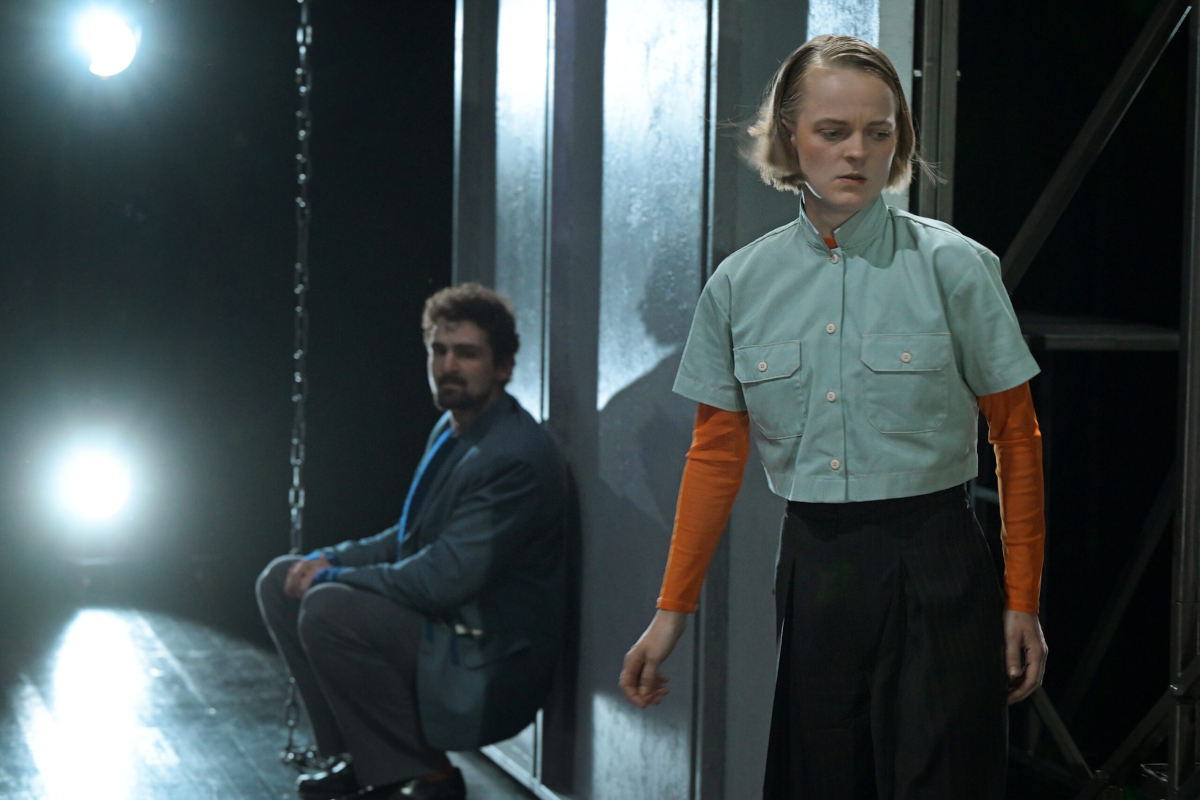 Dort inszeniert der junge Regisseur Luis Dekant das eindringliche Kammerspiel in der kleinsten Spielstätte U17. Zwei mobile Metallgerüste markieren das Innere des Schiffsbauchs, in dem wir uns befinden. Auch wenn die Spieler:innen sie gelegentlich verrücken: einen Ausweg gibt es hier nicht. Carl (Carl Grübel), der Sohn des Kapitäns und Leichtmatrose, hat den Fliehenden an Bord geholt. Rasch sorgt seine Anwesenheit für Zerwürfnisse unter der Besatzung. Schwester Nina nimmt ihn in Schutz, ihr Verlobter, Steuermann Jürgen (Béla Milan Uhrlau), ist eifersüchtig und wäre den Eindringling gern los. Kapitän und Vater Petersen (Holger Kraft) hält sich gern ans Gesetz und hadert mit dem Regelbruch.