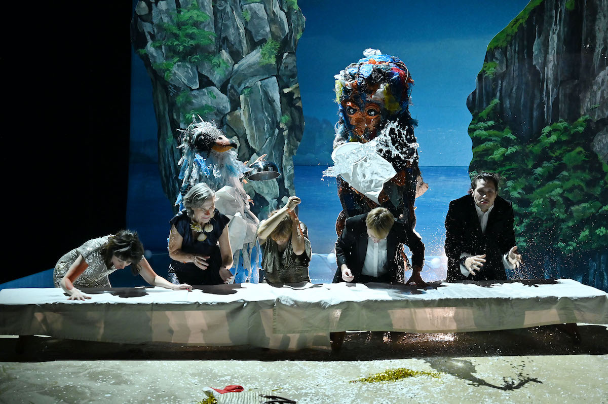 Regisseur Simon Solberg verzichtet in diesem kurzweiligen Abend weitgehend darauf, das Feuerwerk der Boshaftigkeiten mit Klamauk zu überformen. Es gelingen ihm einige inszenatorische Überraschungsmomente. Etwa wenn Evelyn vor einer mächtigen Welle aus Folie surft, die unwillkürlich an den Tsunami am 2. Weihnachtstag vor zwanzig Jahren erinnert. Oder wenn sich nachts aus dem Nebel schälende Meerestiere, die den Strand mit Wohlstandsmüll vollkippen, plötzlich wie die unerlösten Dämonen der Urlaubsgesellschaft wirken.