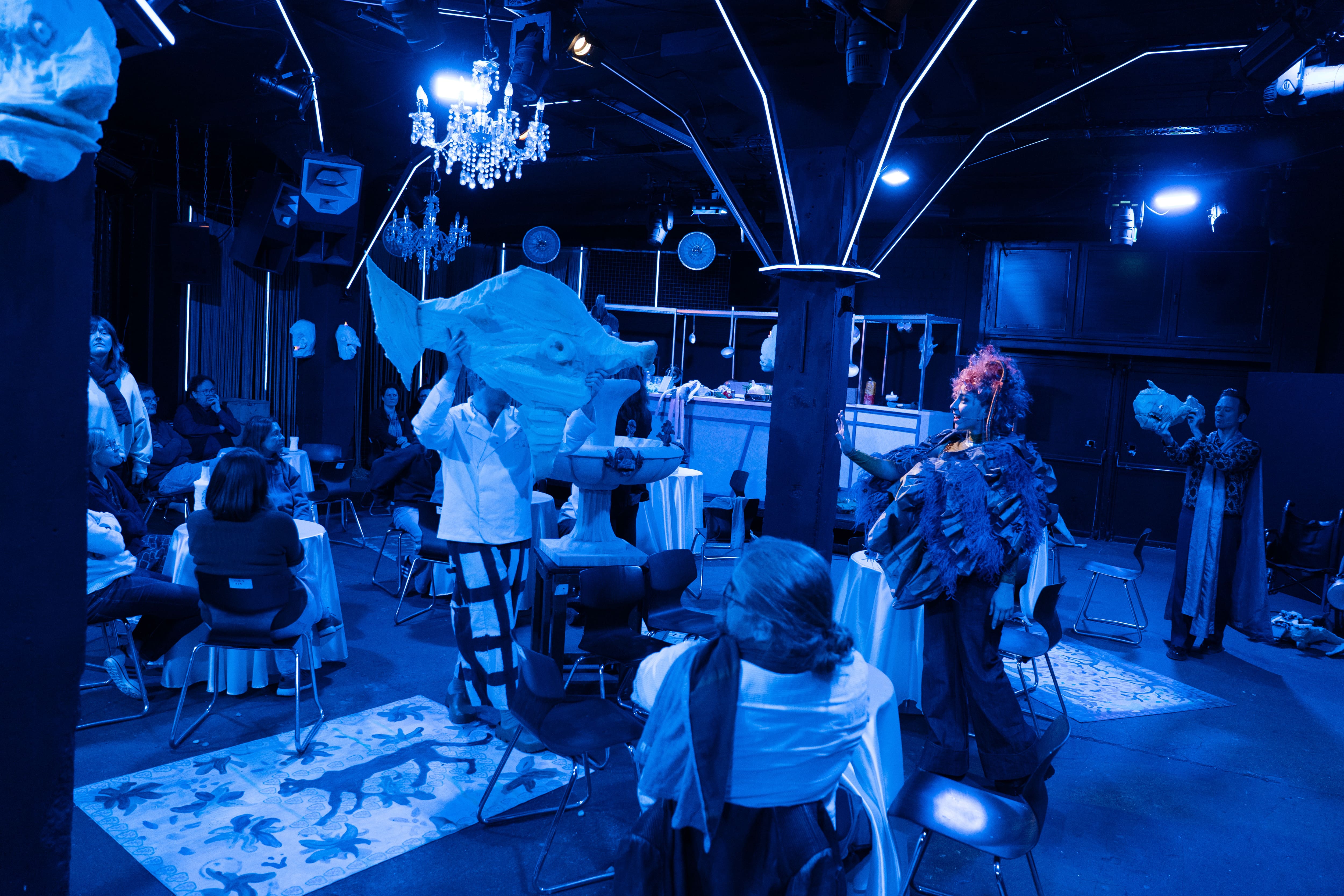 Der Ortswechsel erweist sich als geschickter Move. Er ermöglicht die nötige Intimität, die die Knautschfiguren von Das Helmi brauchen. An der Stirnseite des Raumes steht eine kleine Bühne, auf der hauptsächlich musiziert wird. Rechts von ihr befindet sich die Restaurantküchenzeile. Eingefasst von niedrigen Publikumstribünen stehen in der Mitte des Raumes Tische wie in einem Lokal. Die Puppenspieler:innen bewegen sich zwischen Bühne und Küchenzeile, zwischen den Tischen und auch auf den Zuschauertribünen.