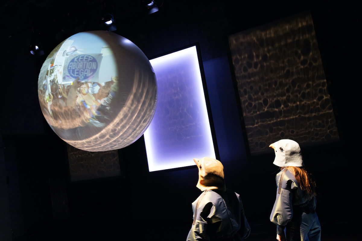 Der tatsächliche Raum ist recht puristisch: Viviane Niebling hat den Boden mit einer schwarzen Lackfolie ausgekleidet, ein paar Stühle stehen am Rand, an der Rückwand ein Triptychon für Projektionen von Nachthimmeln, Laternenschein und Demonstrationen, in der Mitte liegt ein riesiger, weißer Wasserball, dem die Luft ausgegangen ist – und der sich am Ende des Abends zu einer Art überdimensionalem Schwangerschaftsbauch aufblasen wird.