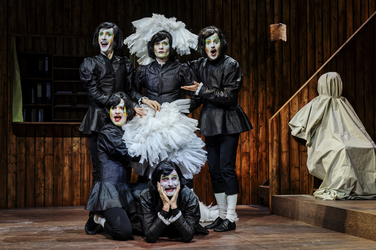 Zunächst erklärt uns ein absichtsvoll mit Halskrause und also eher ironisch-altbacken kostümierter Hamlet vor dem Eisernen Vorhang den Stückwechsel von Sartre zu Müller; Fenster und Türen hat er mit Klebeband auf der Stahlwand markiert, Teile davon reißt er nun wieder ab: Weg mit Sartre! Dann, hinter dem "Eisernen" und nunmehr in Robins hoher, weiter Hütte aus Holz, schmiert sich ein weiterer Hamlet fleißig mit blutroter Creme ein; und bald tummeln sich gleich fünf Hamlet-Klone im Bild, alle gleich in Perücke, schwarzem Leggings-Kostüm und eben der albernen Halskrause. Die Klone sind auch Clowns, und schnell gesellen sich ihnen fünf Ophelia-Figuren hinzu, ähnlich gleichförmig gezeichnet mit ebenfalls schwarzen Ganzkörper-Leggings und durchweg wuscheligen Blondie-Perücken. Außer dem Geschlecht gibt's keine Unterscheidung – und so stürzt sich das doppelte Kollektiv nun in die Müllerei.