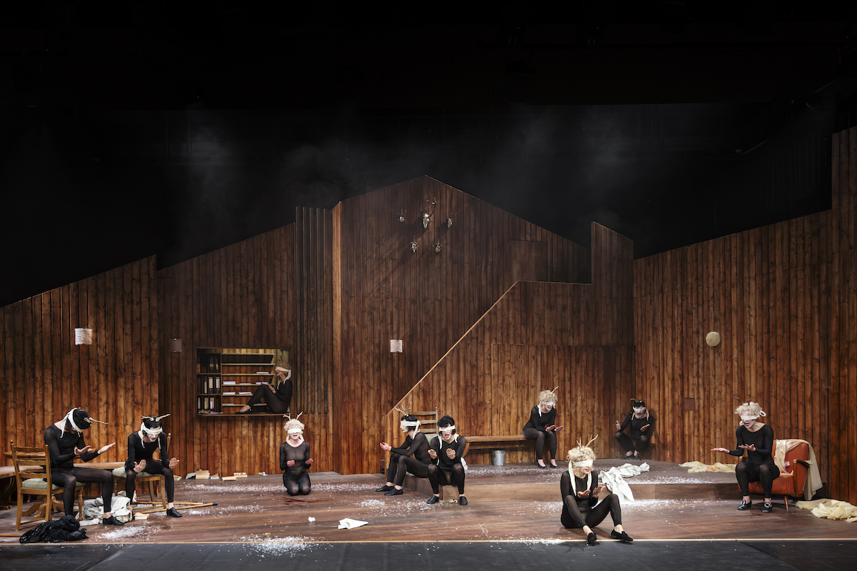 Das Bühnenbild von Louisa Robin allerdings (eine Art Skihütte ganz aus Holz, mit putzigen Geweihen oben an der Rückwand) war praktisch schon fertig gedacht und gemacht – und offen genug ist es, um die ziemlich freie Improvisation zu beherbergen, in die sich das Ensemble mit Weyde hat treiben lassen, um statt der Toten-Welt von Sartre die von Müller zu erforschen.