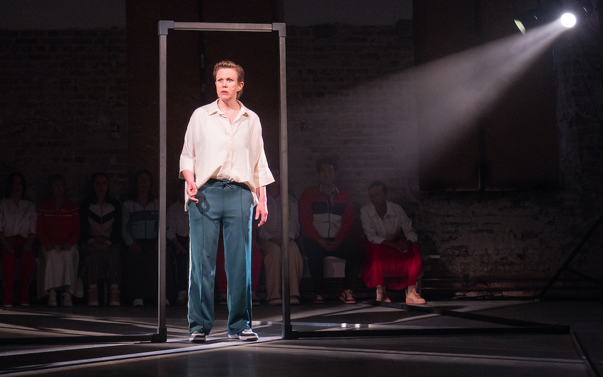 Auf dem Boden in der alten Industriehalle, die auch mal als Puppentheater diente, sind vier Wände abgesteckt. Metallstangen und LED-Bänder zeichnen den Grundriss nach, aufgerichtet steht ein stilisierter Türrahmen. Im Hintergrund ist eine Bank zu sehen. In diesem Raum aus fast nichts positionieren sich die 16 Darstellenden – darunter vier Männer – immer wieder neu. Sie erscheinen entindividualisiert, in ihrer leicht sportiven Klamotte, die wahlweise aus weiße Hemden und Trainingshosen oder Röcken mit Trainingsjacken besteht. Abwechselnd wird aufgesagt und etwas gespielt, dann in den Chor zurückgetreten.