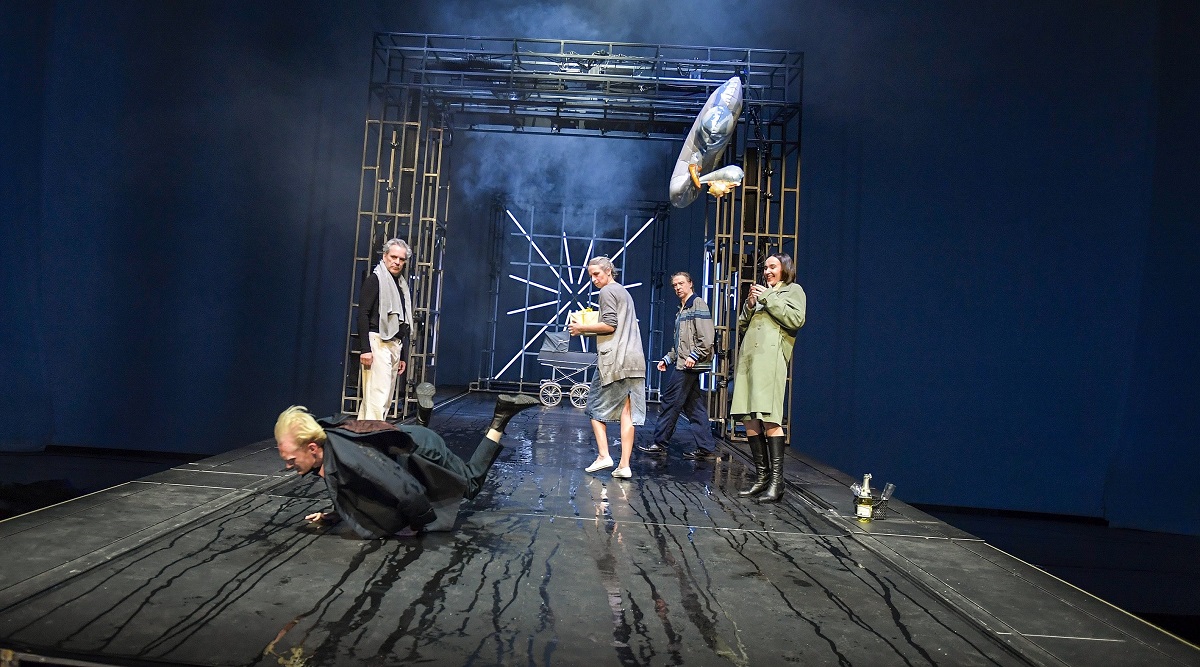 Ich fand das Bühnenbild nicht unterkomplex, sondern passte für eine Realismus-Inszenierung, irgendwie abstrakt und konkret zugleich. Der anhaltende Regen, Nebel und Gewitterblitze setzten zwar eine Grundstimmung, aber es herrschte keine Dauerdepression, war der Regen doch auch mal augenzwinkernd eine Dusche oder der Nebel eine Dampfbügelstation.