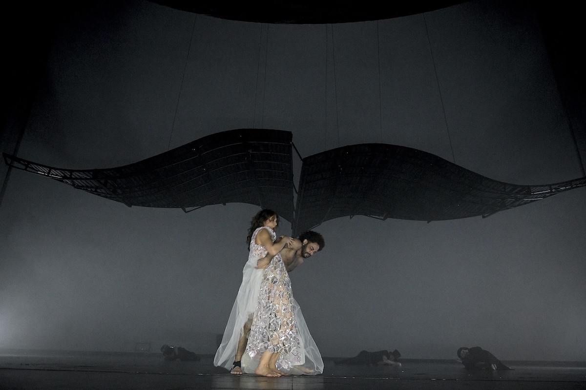 Die zweite Hälfte nach einem sagenhaften ersten Teil ist Ambiente-Theater pur. Kostümbildnerin Adriana Braga Peretzki zaubert den Spielern weiter stummfilmexpressionistische Dresses auf die schlanken Glieder. Rauchschwaden ziehen, alle streunen, alle kreuzen hierhin, dorthin. Seltsam, im Nebel zu wandern! Jeder ist allein. Vom Bühnenhimmel her bäumt sich ein riesiges Flügelpaar auf, gemahnt bald an eine Lunge, bald an ein Schiffssegel. Für eine Reise wohin? In die Nacht? Aus der Nacht heraus? Wo kann das Dunkel enden?