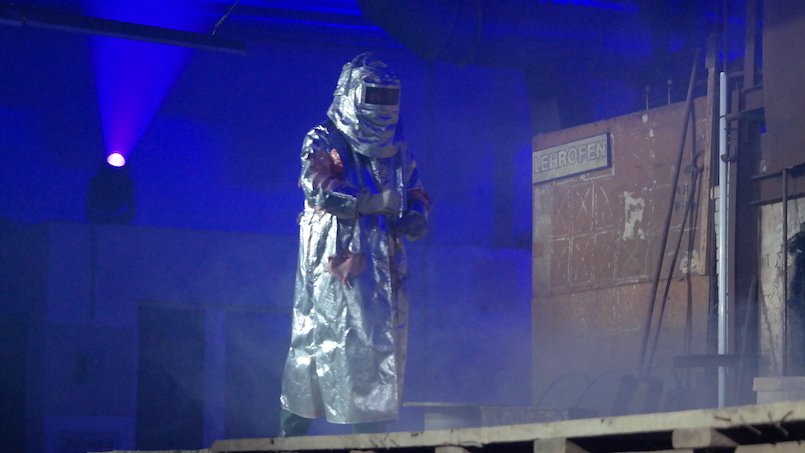 Noch bevor das erste Wort gesprochen ist, drängt sich die Frage auf, ob man wirklich jedes Stück an jedem Ort spielen kann. Worin besteht der Mehrwert von Aufführungen an solch suggestiven Orten, deren Flair von Inhalten und Abstraktionen eher ablenkt? Umso mehr, wenn – wie hier in Weißwasser – neben den Öfen auch Einbauten wie die Abteilungsleiterkabine für Auftritte genutzt werden und man unwillkürlich über die metaphorische Bedeutung eines Schildes "Tragfähigkeit 2 410 kp/m²" nachdenken muss.