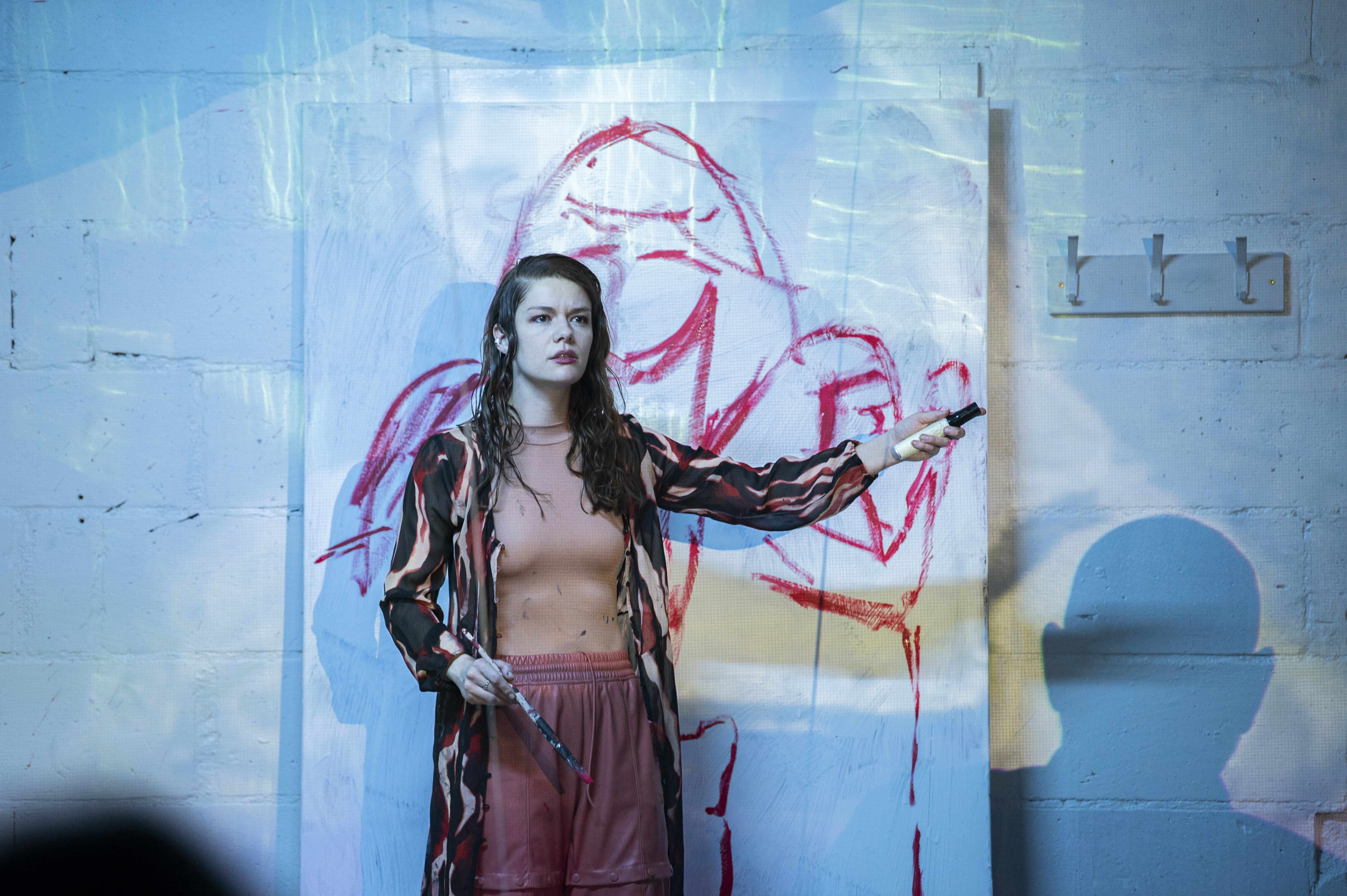 Und schließlich Desdemona in ihrem Gemach, Schutzraum. Ihre Liebe, ihre Hingabe ehr- und zerbrechlich. In ihrem Raum wird die Mechanik des Zweifel(n)s, des wirkenden Gifts am deutlichsten. Sie malt sich die Zukunft aus, übermalt, projiziert. Überlagerungen der Uneindeutigkeit. Und doch: Gewalt.