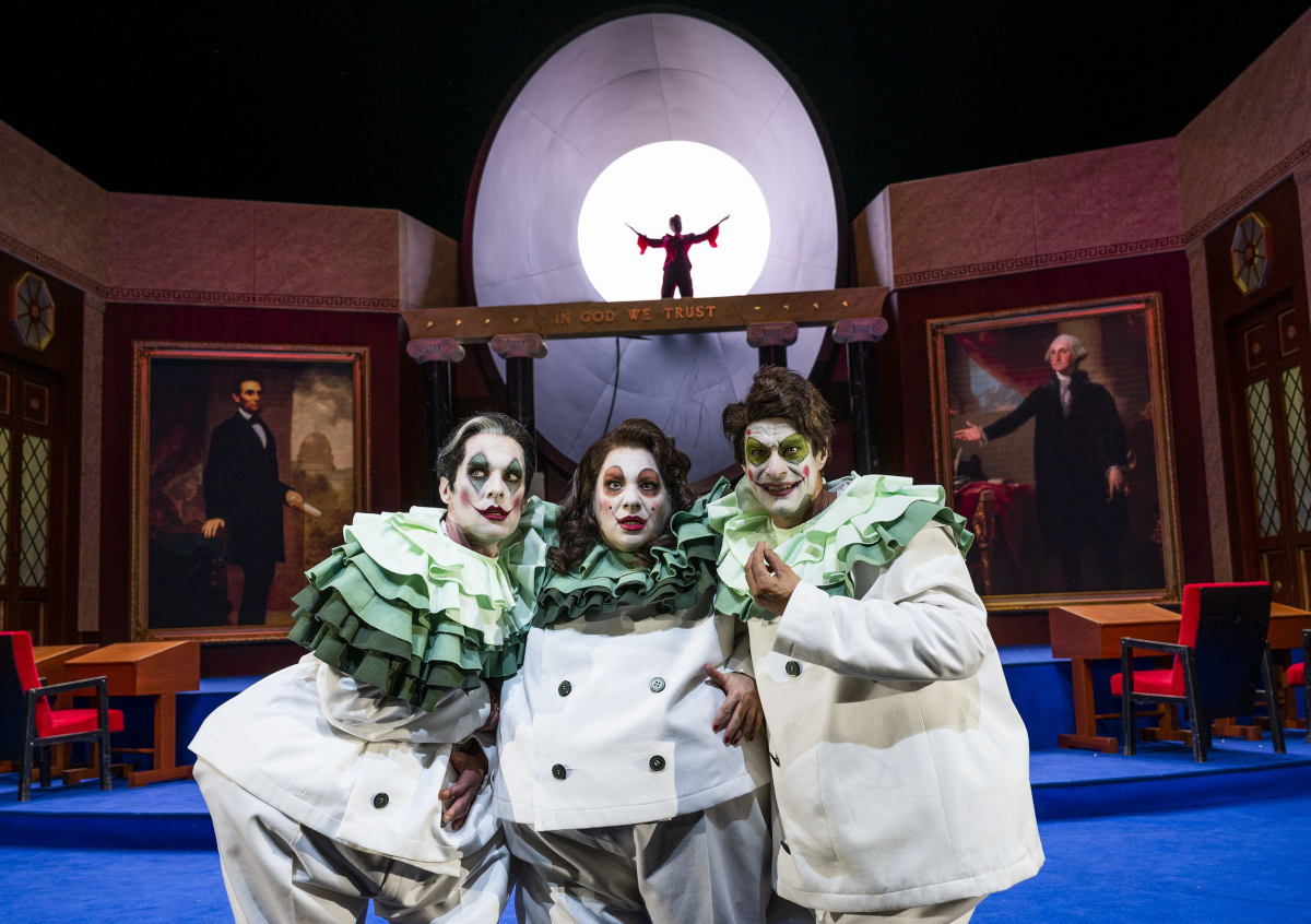 Oben im Hintergrund klafft ein Loch mit Rutsche, das dank Lichteffekte wie die Irisblende im „James Bond“-Vorspann wirkt. Die Bühne wird permanent von grellen Clownsfiguren bestürmt, bei denen in Optik und Bewegungen Charaktere aus dem Batman-Universum anklingen. Arturo Ui sucht Gotham City heim, Joker und Pinguin watscheln im Gefolge.