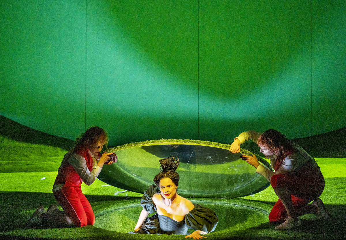 Nicht minder kraftvoll die folgende chorische Passage. Die Rheintöchter referieren – in grüner Au, umgeben von Mauern –, wo Deutschland herkommt, wo es steht. Dass dabei die linke Abneigung gegen dieses Land aus jeder zweiten Zeile ätzt, kann man mögen oder nicht, aber der rebellische Duktus macht Staunen und hoffen, dass der Abend genau so bleibt. Wild. Politisch. Frei. Was er zunächst tut, indem er auf die berühmten Märchen-Frauen der Gebrüder Grimm schaut. Besser gesagt, indem er sie selbst überhaupt mal zu Wort kommen lässt. Schneewittchen fragt, warum man ihr einen Prinzen wünscht, ausgerechnet ein "rich kid" mit eher schlechtem Ruf, der sie dann auch noch ungefragt (vom Apfelbiss betäubt), auf den Mund küsst. Schneewittchen, Aschenputtel, Blaubarts Frauen – nicht nur feministisch betrachtet sind die Grimm’schen Frauen im Wesentlichen Männer-Opfer. Wenig märchenhaft, eher gruselig, aber traumhaft gespielt, mit scharfem Humor und illustren Bildern.