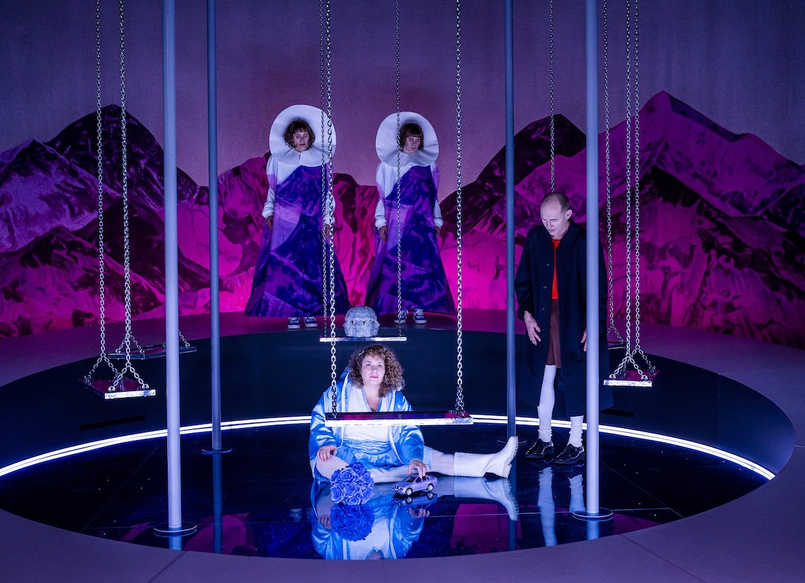 Aleksandra Pavlovićs Bühnenbild verfremdet das Bergdorf durch ein Metallgestänge, an dem Schaukeln hängen, die das Zentrum der Bühne bilden. Drumherum: ein angeschrägter, kreisrunder Steg vor einer Alpenkulisse. In diesem unendlichen Kreislauf zeigt sich mit jedem Abreißen eines Gaze-Rund ein tieferer Blick ins Innere. Doch außer einer hell leuchtenden Lampe ist der Kern leer.