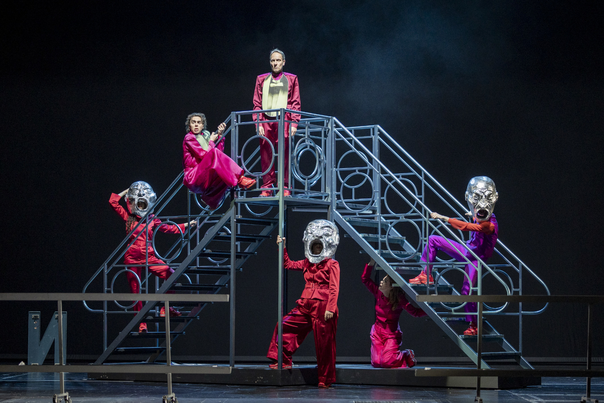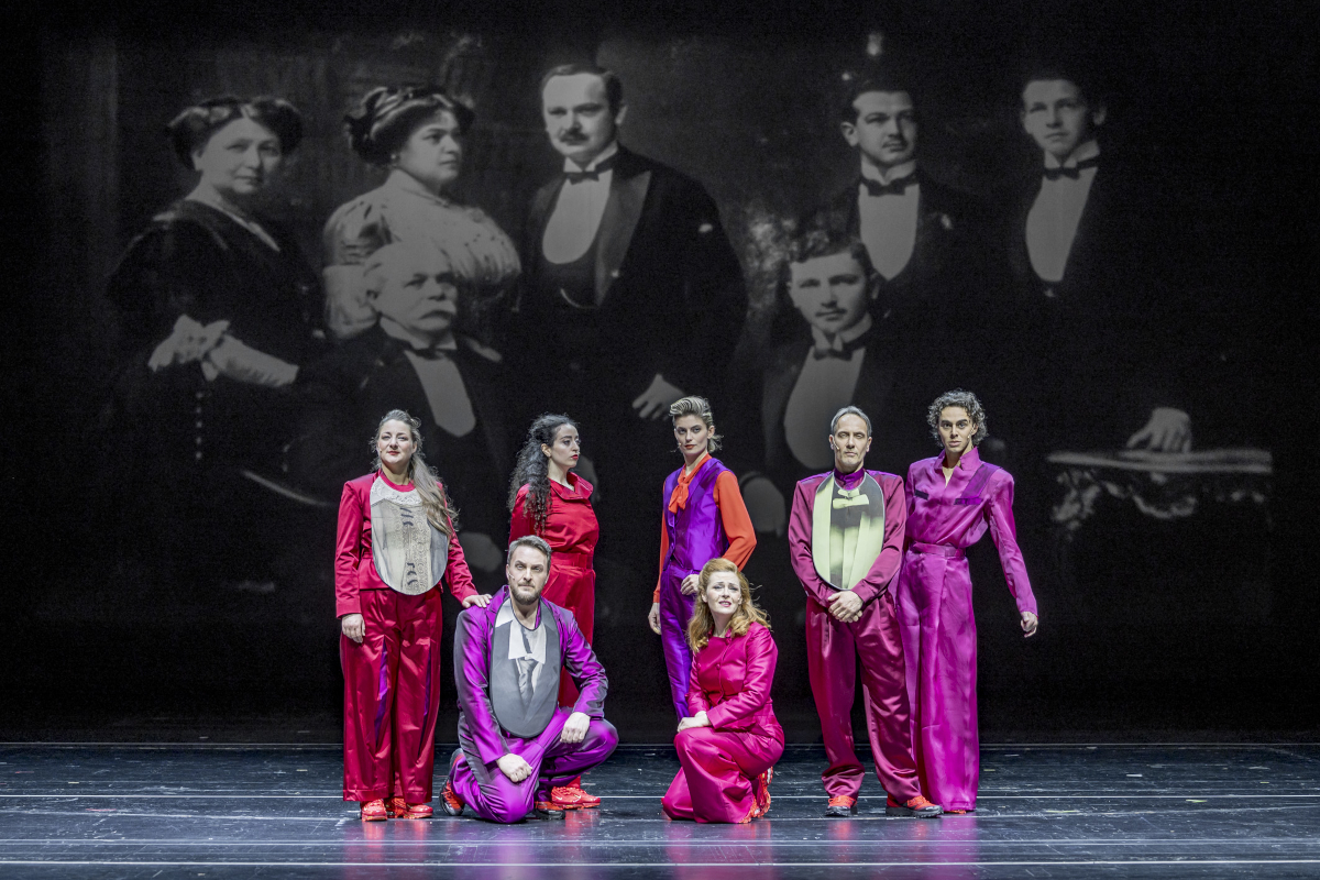 Sieben Meriels stehen anfangs auf der Bühne. Das Ensemble trägt Hosenanzüge aus glänzendem Purpurstoff. Später wird jede*r Schauspieler*in Stellvertreter*in eines weiteren Mitglieds der Familie Schindler. Dazu legen sie Latze an, auf die die passende Hemdbrust, Fliege oder ein Kittel gedruckt sind (Bühne und Kostüme: Mai Gogishvili). Sara Nunius bleibt als einzige den ganzen Abend Meriel und sagt "ich" – die anderen "Figuren" beschreiben in der dritten Person, behalten die Distanz des Forschungsberichts.