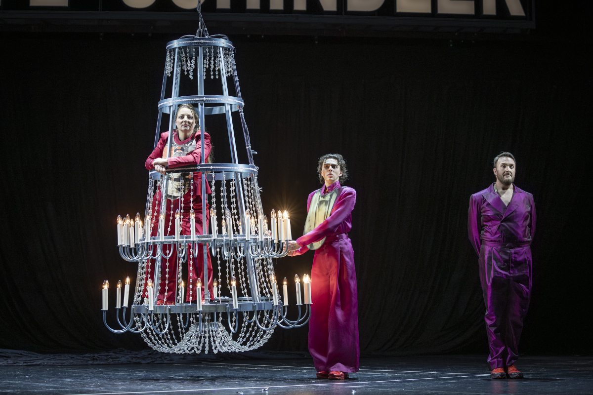 Auf einer ansonsten leeren, schwarzen Fläche helfen große Requisiten-Kulissen bei der Orientierung: So steht ein riesiger Lüster für die Villa, die die Schindlers sich in Innsbruck bauten und die sich der Gauleiter Hofer unter den Nagel reißt. Eine große Leuchtschrift repräsentiert das Café. Auf projizierten Fotos sehen wir die echten Familienmitglieder.