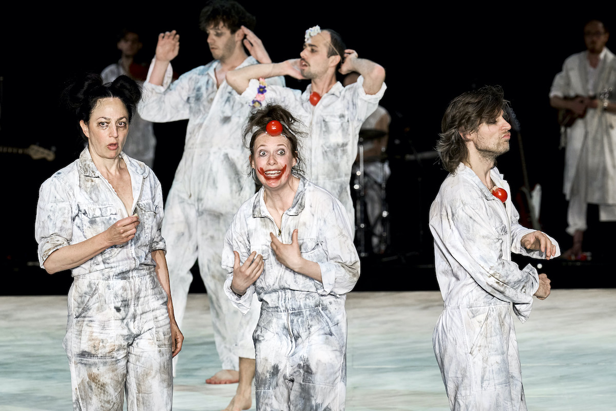 Unwidersprochen schön bleiben darf es freilich auch nie. Als Antwort erklärt Kirstin Schwab Kipppunkte. Zuvor hat sie aufgezählt, welche von ihren Kolleg:innen allein sind (quasi alle). "Und ich ...", schließt sie. "Ich habe das Publikum." Stets dessen Amüsement verpflichtet, trägt das Ensemble rote Clownsnasen. Umso stärker fällt auf, dass man nicht wie sonst beim aktionstheater Tränen lacht, bevor man sie weint. Es geht melancholisch zu, wie in diesen Folgen kultiger Sitcoms, in der Zusammenschnitte aus alten Episoden die Sendezeit füllen. Das Selbstreferenzielle referenziert nochmal sich selbst.