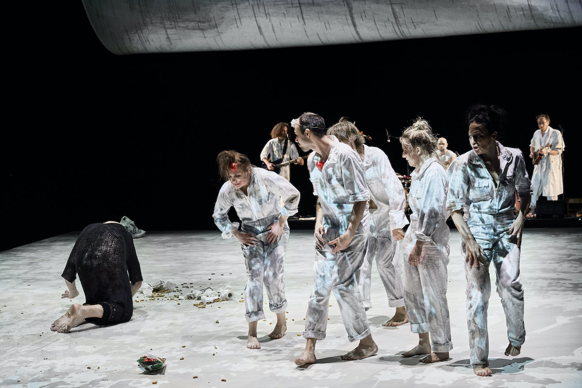 17. Mai 2024. Triste Regenwolken über Bregenz. Die Hauptstadt von Österreichs westlichstem Bundesland will den Trend Sommer nicht mitmachen. Jedenfalls kommt einem das grau-in-graue Himmelszelt über der Bühne des Vorarlberger Landestheaters von draußen bekannt vor. Hier ist es nur Videokunst, an Wände und Decke projiziert. Die Wolkensuppe findet sich auch auf den Arbeitsoveralls der Menschen auf der Bühne. Vier Musiker sind es und sechs Schauspieler:innen, alte Bekannte aus dem aktionstheater ensemble. Das wird heute – Schlechtwetter und Dauerkrise zum Trotz – gefeiert, denn es besteht seit 35 Jahren.