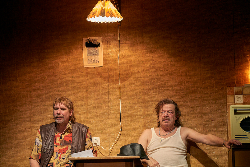 Das Stück ist so schwarzhumorig wie es tragisch ist. Mateja Koležnik setzt in ihrer Inszenierung am Wiener Akademietheater aber vor allem auf die Komödie. Ihre Figuren sind überzeichnet bis hart an die Grenze zur Groteske: Coleman (Roland Koch) und Valene (Michael Maertens) sind ausstaffiert wie Menschen aus der vorgeblichen Unterschicht im Reality-TV, mit Joggern und speckigen Anzügen, Kunstleder-Gilets, geschmacklosen Musterpullis, Vokuhila-Topfhaarschnitten und 80er-Jahre-Schnauzern. Allein die Kostüme sind ein Fest (Ana Savić-Gecan), aber ein bisschen vorgeführt werden diese Figuren schon auch.