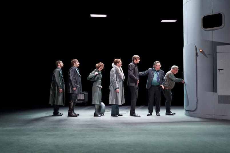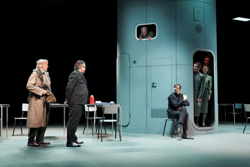 Mateja Koležnik versetzt Gogols Komödie aus dem 19. Jahrhundert in ein Setting, das eher nach Realsozialismus und Kaltem Krieg aussieht. Auf der Bühne (Klaus Grünberg) nur ein runder, grau vertäfelter Bau, der im Inneren über eine Treppe verfügt, die – so hört man die Figuren berichten – mehrere Stockwerke hinauf bis zu einer Dachterrasse führt.