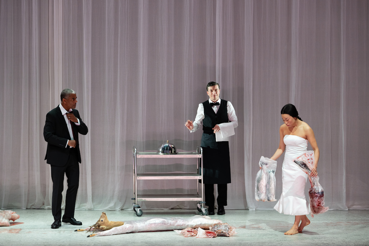 In ein schlichtes Setting aus weißen Vorhängen zerrt Yun ein in Plastikfolie gepacktes Fleischstück nach dem anderen. Sie tut es in Zeitlupe – ein weiteres beliebtes Mittel von Marie Schleef –, und in Zeitlupe (beziehungsweise Schockstarre; der Übergang ist fließend) reagieren die anderen darauf: der Gatte, die Eltern (Hans Dieter Knebel und Dunja Sowinetz), die Schwester (Alexandra Henkel), der Schwager (Philipp Hauss) und sogar der Kellner im Nobellokal (Jonas Hackmann). Gesprochen wird dabei, zum Glück, in normalem Tempo.