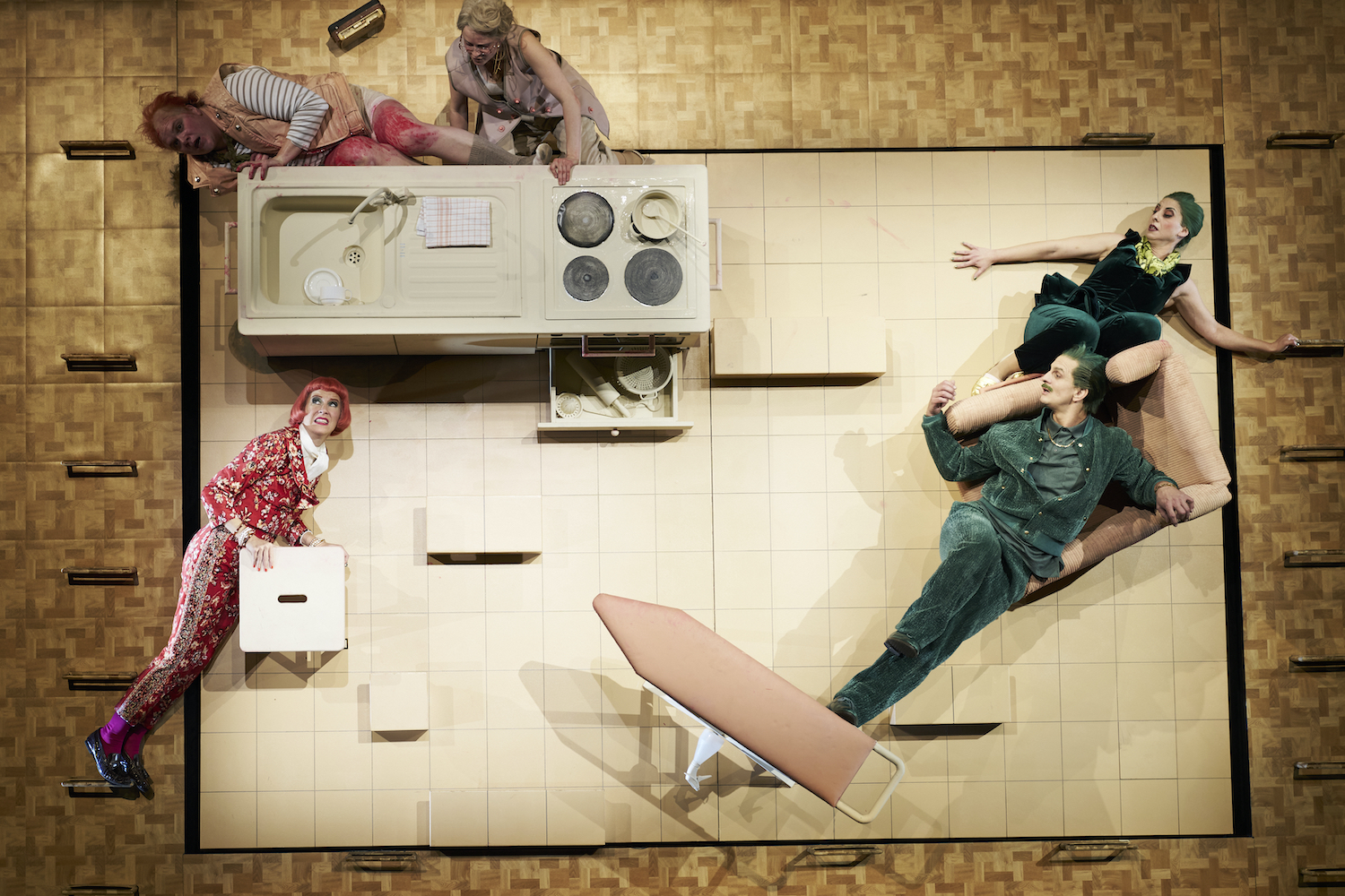 Wie albern und harmlos kann ein Abend daherkommen, in dem es um einen Milieukrieg aller gegen alle in einem Mietshaus geht, garniert mit Alkoholmissbrauch, Vulgärsprache, Kindesmisshandlung, Massengiftmord und Gewaltfantasien bis Hirnfick mit Mutter? Vielleicht sogar so sehr, bis es fast wehtut. Immerhin, so könnte man einwenden, verwehrt sich die Inszenierung in ihrer an Filme von Wes Anderson erinnernden Stilisierung von Pastelltönen bis Tannengrün einem hyperrealistischen Sozialvoyeurismus mit bekleckertem Feinrippunterhemd.
