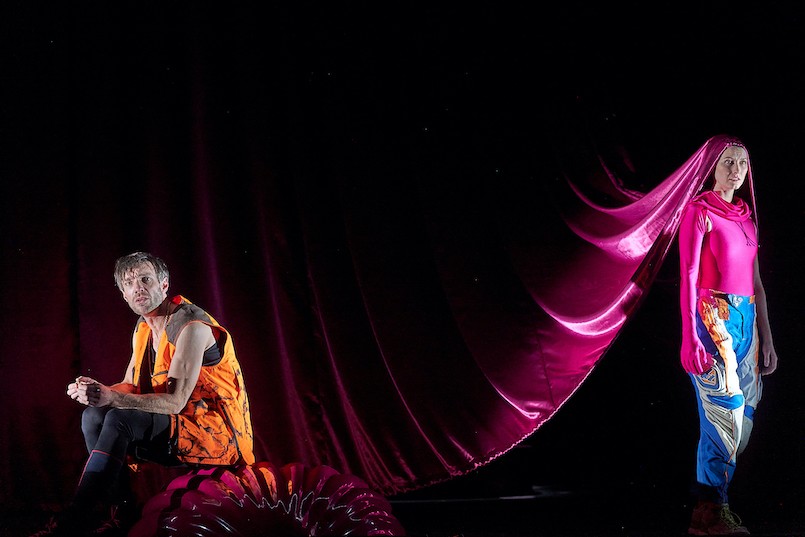 Stefan Hageneier ist mit seinem Bühnenbild dem berühmtesten Monolog des Stücks gefolgt: "Die ganze Welt ist Bühne" – daher ist sie überall gleich, sei es am Hof des Herzogs oder hinter den sieben Bergen in der Welt der Schäfer. Es gibt keine Natur, alles ist und bleibt streng künstlich: eine Manege, über der rosa Neonringe schweben, von denen Vorhänge herunterhängen, alles pinkmetallic; an der Hinterfront ein rosa Neonrahmen. Als sich der Vorhang zum ersten Mal im Ardenner Wald öffnet, steht da ein riesiges rosa Hochglanzeinhorn im Stil Jeff Koons'.
