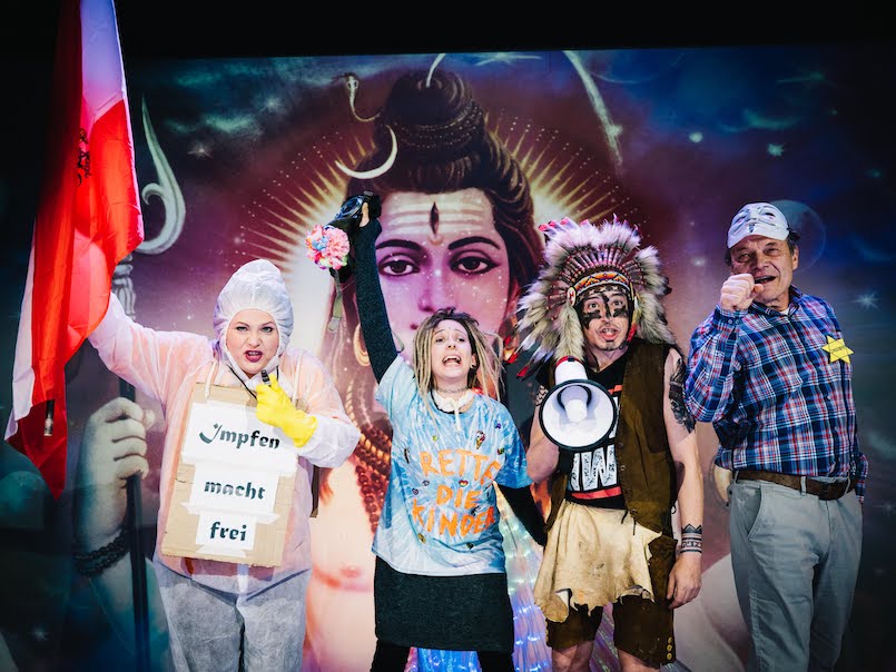 Und der ironisch-distanzierende Tonfall, mit dem die Inszenierung jeden einzelnen Satz seiner größtmöglichen Lächerlichkeit preisgibt, lässt dann überhaupt keinen Zweifel aufkommen: An diesem Abend soll gelacht werden, über die anderen, die Covidioten, diejenigen mit den ungenauen Argumentationen, die Antoine de Saint-Exupéry zitieren oder ein Lob der Phantasie über die Wirklichkeit anstimmen. Denn sie werden immer schon Nazis gewesen sein. Und wenn es dann inhaltlich übergangslos klassistisch, sozialdarwinistisch und rassistisch wird, dann darf es das Publikum im Lachen eh schon gewusst und geäußert haben. Was genau? Jedenfalls Selbstaffirmation: So sind die anderen und wir sind null verwandt.