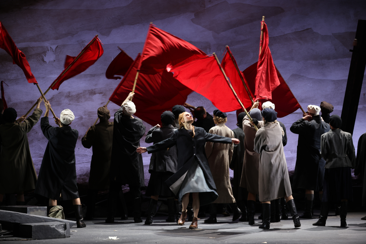 Der Chor selbst erfüllt seine vielfältigen Aufgaben vorbildlich, wirkt aber doch gar inflationär eingesetzt – und nicht gerade subtil: Mehrere der von Matthias Jakisic vertonten und von einer Loge neben der Bühne aus mit vollem Körpereinsatz auf der Geige begleiteten Liedtexte werden frontal ins Publikum gebrettert. Sind sie sozialistisch, kommt zu den roten Fahnen auch noch rotes Licht. Das ist ... viel.