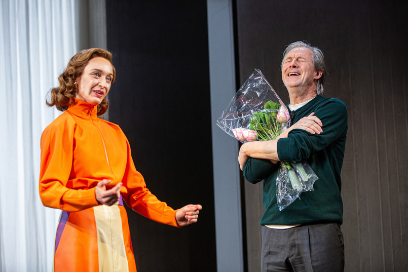 Programmierlücke bei der Geschenkannahme: Silvia Meisterle als KI und Joseph Lorenz als Alterumsprof auf Christian Schmidts Bühne © Astrid Knie