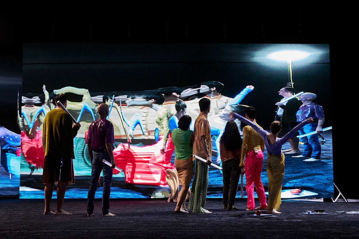 Auf einem riesigen Screen an der Hinterwand sieht man etwas, das wie eine öde Steinwüste aussieht. Noch zwei weitere Screens begrenzen den ovalen Raum. Dann erkennt man in dem vermeintlichen Felsboden den stark vergrößerten Bodenbelag und sieht, wo die Bilder herkommen: Ein meterhoher dreigliedriger Roboterarm mit Kameraauge bewegt sich hin und her und filmt das Geschehen auf der Bühne. Die Aufnahmen der Schauspielerinnen sind nur kurz real, dann werden sie gedehnt, verzogen, die mondrianartigen Farbflächen ziehen in Schlieren ineinander, bis ein sich stetig veränderndes Band aus abstrakter Videokunst entsteht (Video Art: Luis August Krawen).