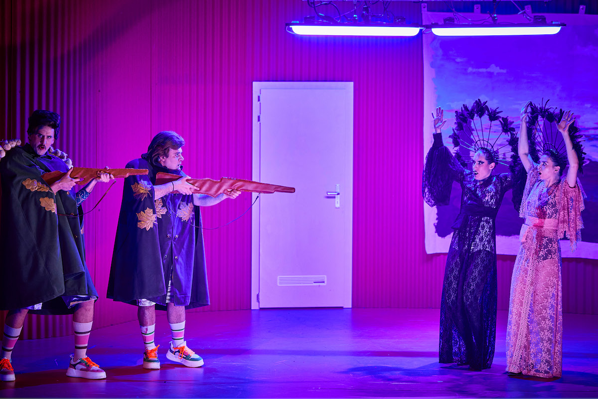 Statt mit Holzpflock mit Holzgewehren bewaffnet: Die Herren Vampirjäger Elias Eilinghoff und Samouil Stoyanov, rechts: Annika Meier, Lavinia Nowak © Marcel Urlaub / Volkstheater