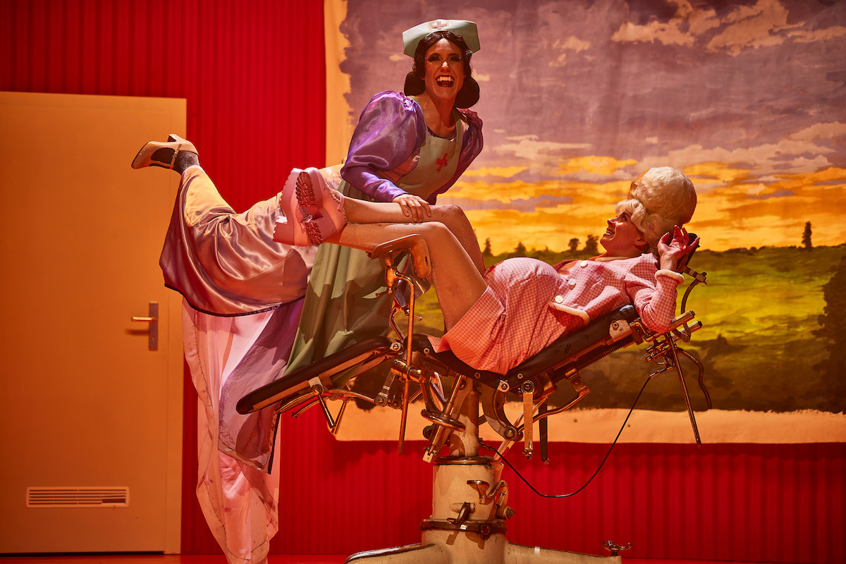 Bühnenbildnerin Patricia Talacko hat im hellroten Wellpappestil an die Rampe eine Blutkonservenbar und auf die Drehscheibe ein Gebäude mit wenigen Türen gestellt, ein Symbol für den unergründlichen Frauenkörper, den es unerschrocken mit schwankender Live-Kamera (Ulrike Schild) zu erkunden gilt. Die Kostüme (Andreas Auerbach) strotzen vor liebevollem Luxus: So erinnert der bluttriefende Pflock in der Vampirin Brust an eine in Glitzer getunkte Koralle. Die Männer in vom Jogging- bis zum Showmaster-Anzug protzig schimmernder Gewandung sind äußerst Eighties, während Carmilla von Anfang an in den Fünfzigern steckt. Nosferatueske Schrifteinblendungen erweitern die Reise zurück in der Zeit.