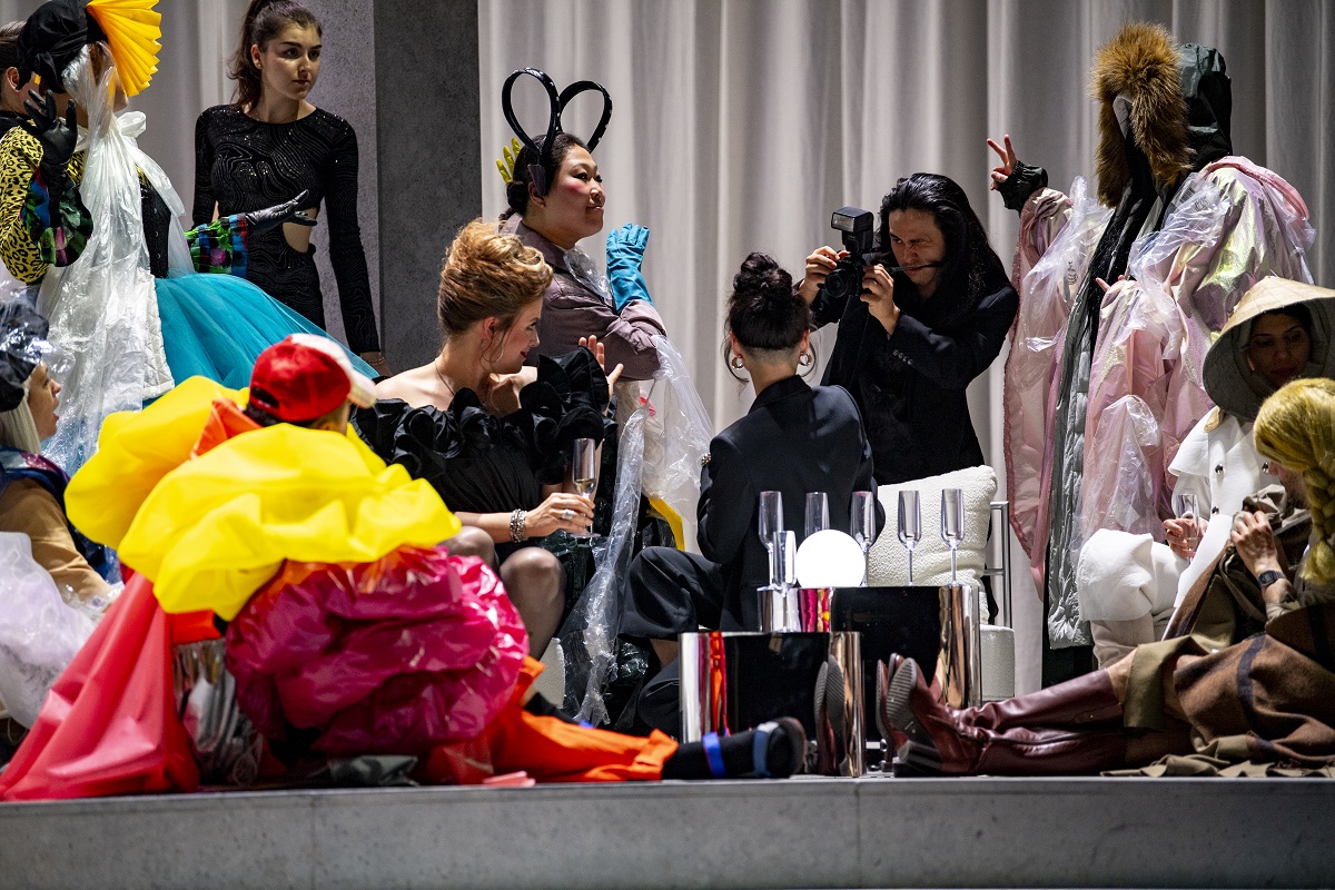Was ein wenig nach Ostalgie klingt – so weit muss man aber gar nicht gehen. Unbestreitbar bleibt der soziale Bruch, wie er auch in anderen politischen Zusammenhängen (zum Beispiel zu Tschaikowskis Zeit) vorstellbar ist. Was vordem der leicht heruntergekommene Kiosk von Tatjanas Familie war, ein formloser Treffpunkt aller möglichen Freunde mit verwilderter, überwucherter Beton-Pergola – es ist jetzt eine zum Gefrieren gestylte Champagnerlounge in Weiß und Silber, der bunte Aufzug der skurrilen Freunde dem kalkulierten Defilee einer bizarren Modenschau gewichen.