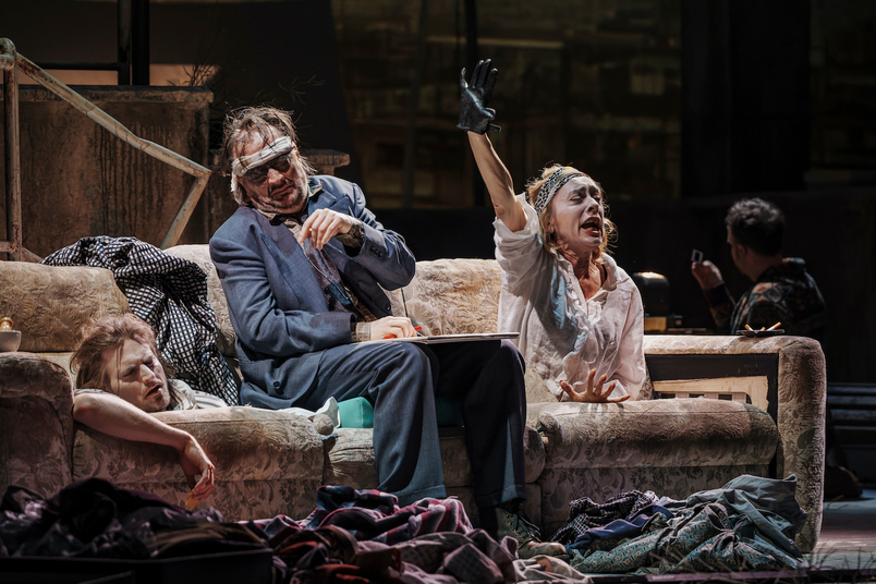 Das passt auch zur zwar werkgetreuen, aber eher auf eine familiäre Deutung zugeschnittenen Textauswahl, die Kurtág für seine Oper gewählt hat und die durch den Prolog sogar noch eine tendenziell helle Vorgeschichte bekommt, in der die "Mutter" Nell (Ursula Hesse von den Steinen) auf den Dachfirsten balancierend Becketts Gedicht "Roundelay" über den Klang von Fußspuren am Strand vorträgt. Während "Sohn" Clov geschäftig über die Bühne wuselt und nostalgisch in alten Fotos und Dias wühlt, die er später auch projiziert, taucht der blinde Hamm (Nathan Berg) – als "Vater" und "Sohn" Zwischenglied der Genrationen – aus einem Lumpenberg auf und thront fortan herrisch auf seinem Sofa über der Figurenkonstellation.